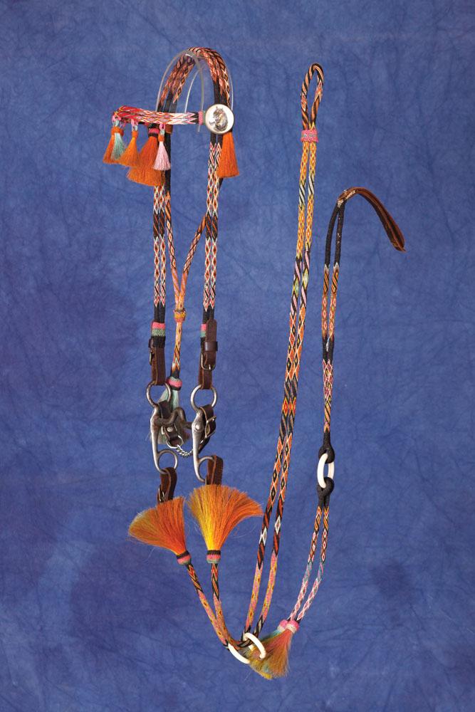 Colorful hitched horsehair bridle with bright pink, turquoise, orange, red, white and yellow diamonds over black background. 5 tassels across forehead band, double reins with celluloid rings and romel. Domed horsehead rosettes. Some wear spots on horsehair down to core, leather popper split on end. Overall bright and supple.