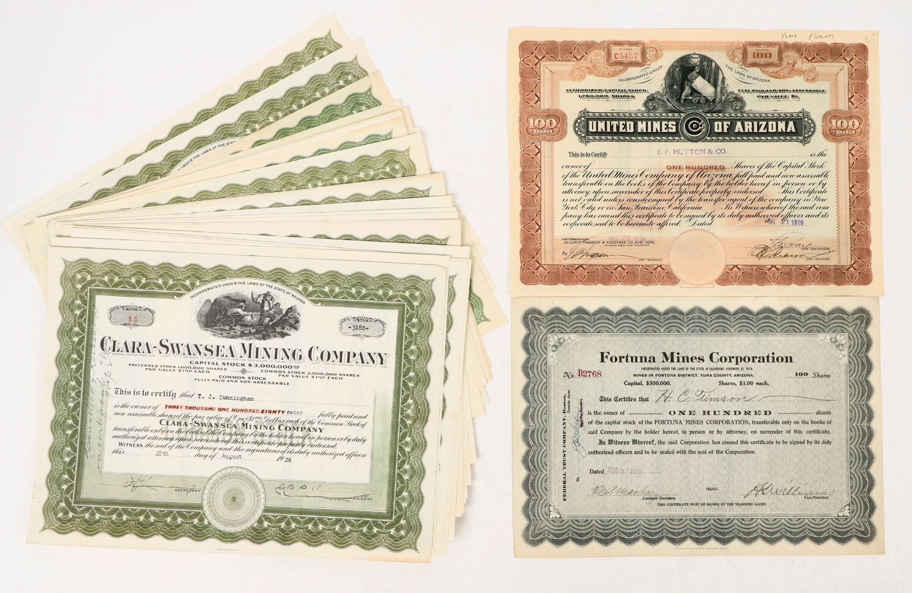 About 30 total Yuma Arizona Stocks, 3 Different c.1915-1930. 1 stock from United Mines of Arizona, 1 stock from Fortuna Mines Corporation and 28 from Clara-Swansea Mining Company. All issued. See photo.