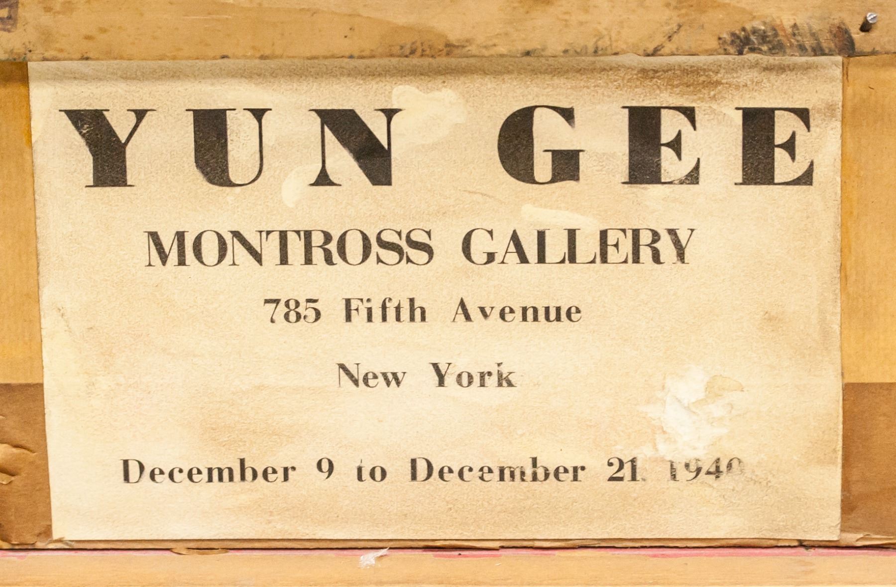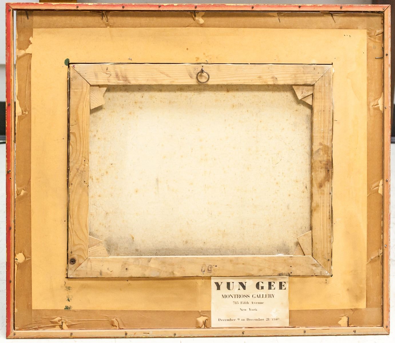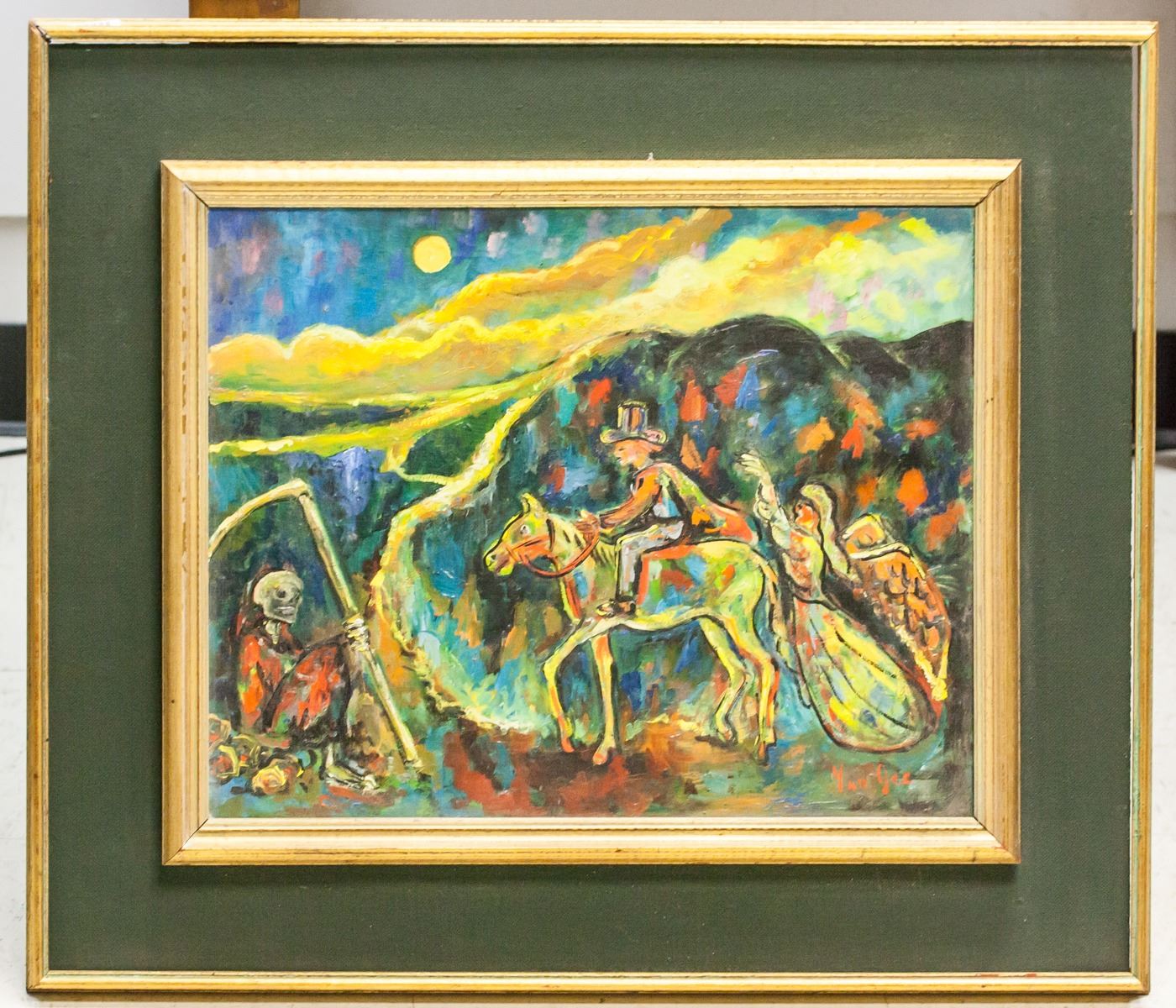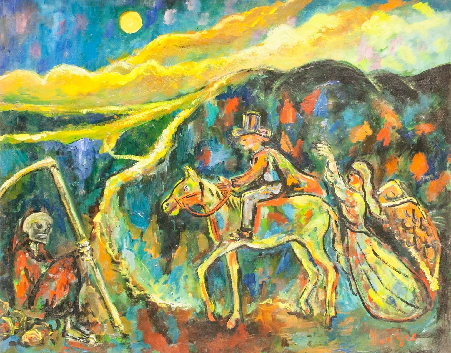 Oil on canvas, framed. Featuring a rider meeting Death and an Angel. Signed "Yun Gee" in the bottom right corner. Label on verso reads "YUN GEE / MONTROSS GALLERY". Frame is loose. Attributed to Yun Gee (1906-1963, Chinese). Canvas size: 39 x 49 cm (15.25 x 19 inches). Frame size: 62 x 72 cm (24.25 x 28.5 inches).