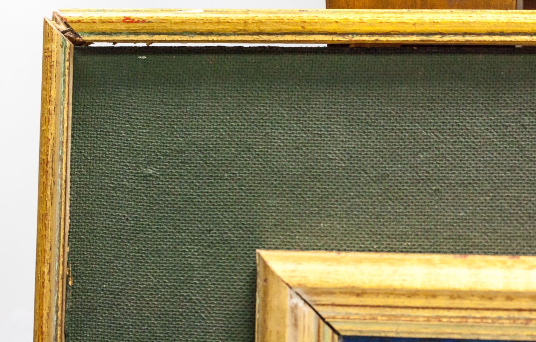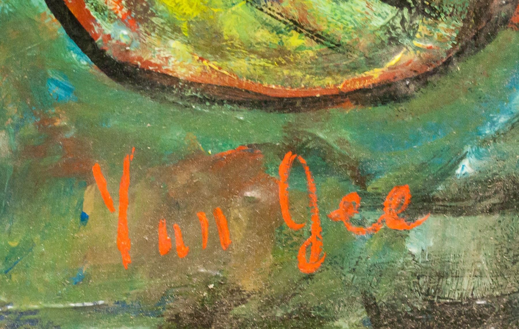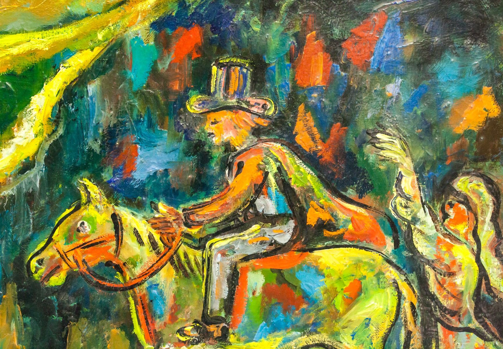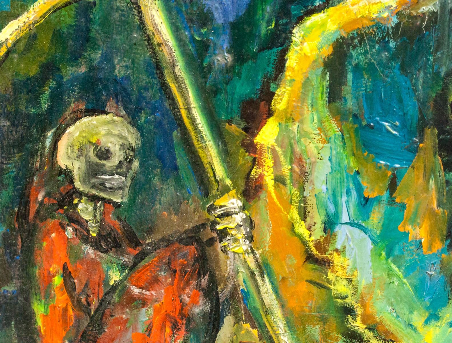 Oil on canvas, framed. Featuring a rider meeting Death and an Angel. Signed "Yun Gee" in the bottom right corner. Label on verso reads "YUN GEE / MONTROSS GALLERY". Frame is loose. Attributed to Yun Gee (1906-1963, Chinese). Canvas size: 39 x 49 cm (15.25 x 19 inches). Frame size: 62 x 72 cm (24.25 x 28.5 inches).