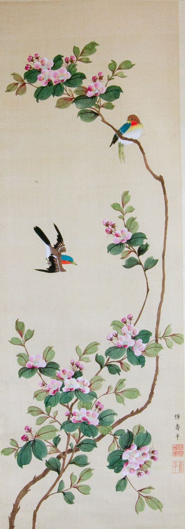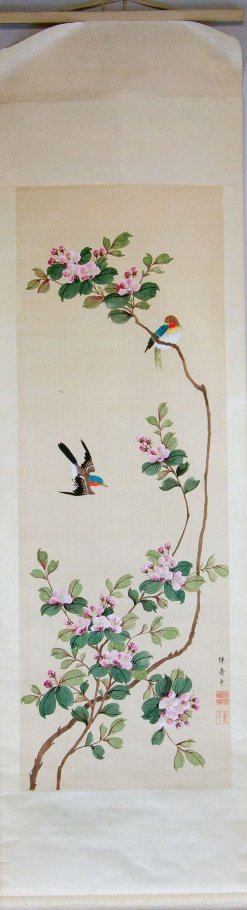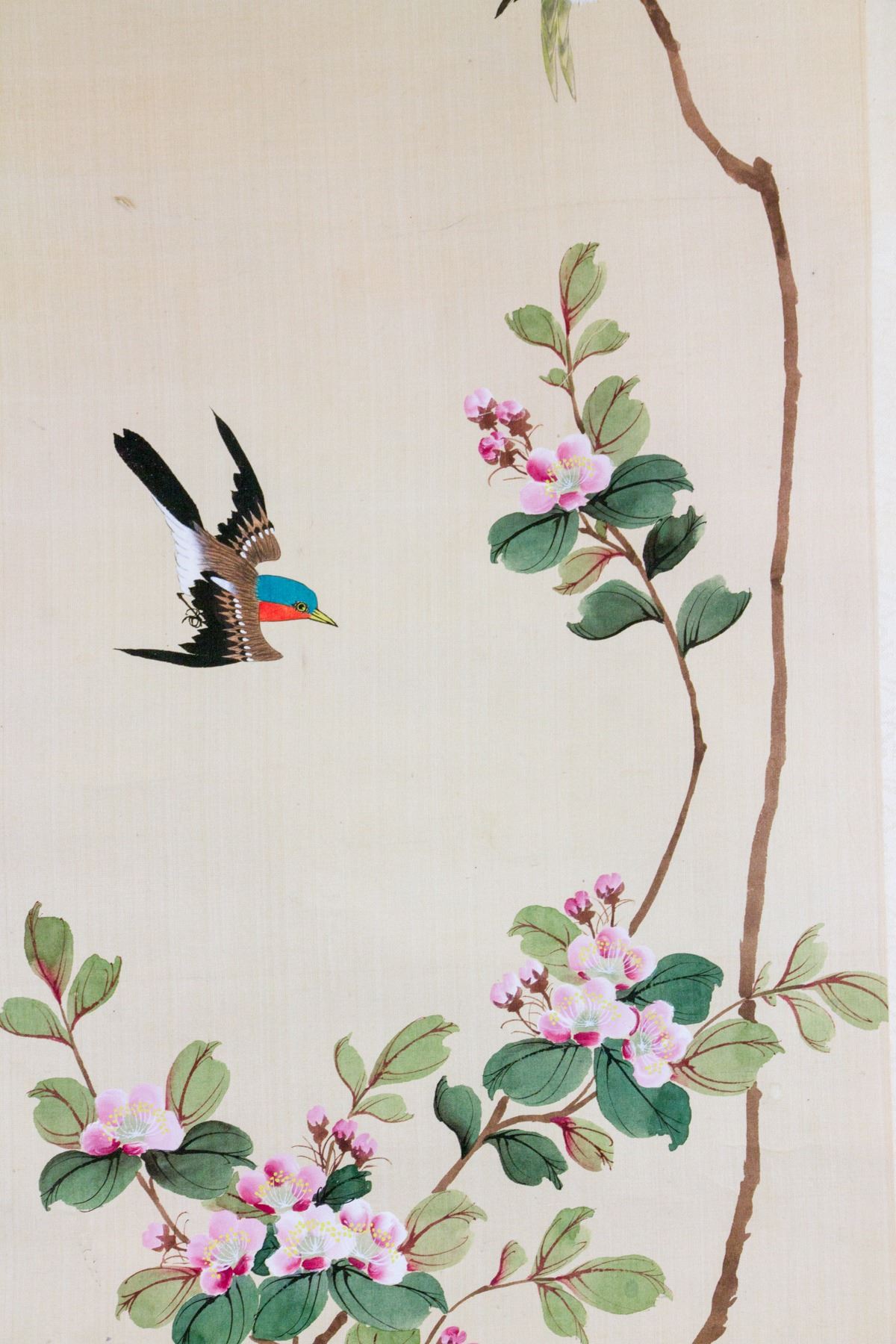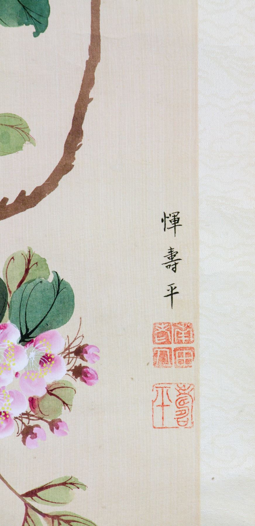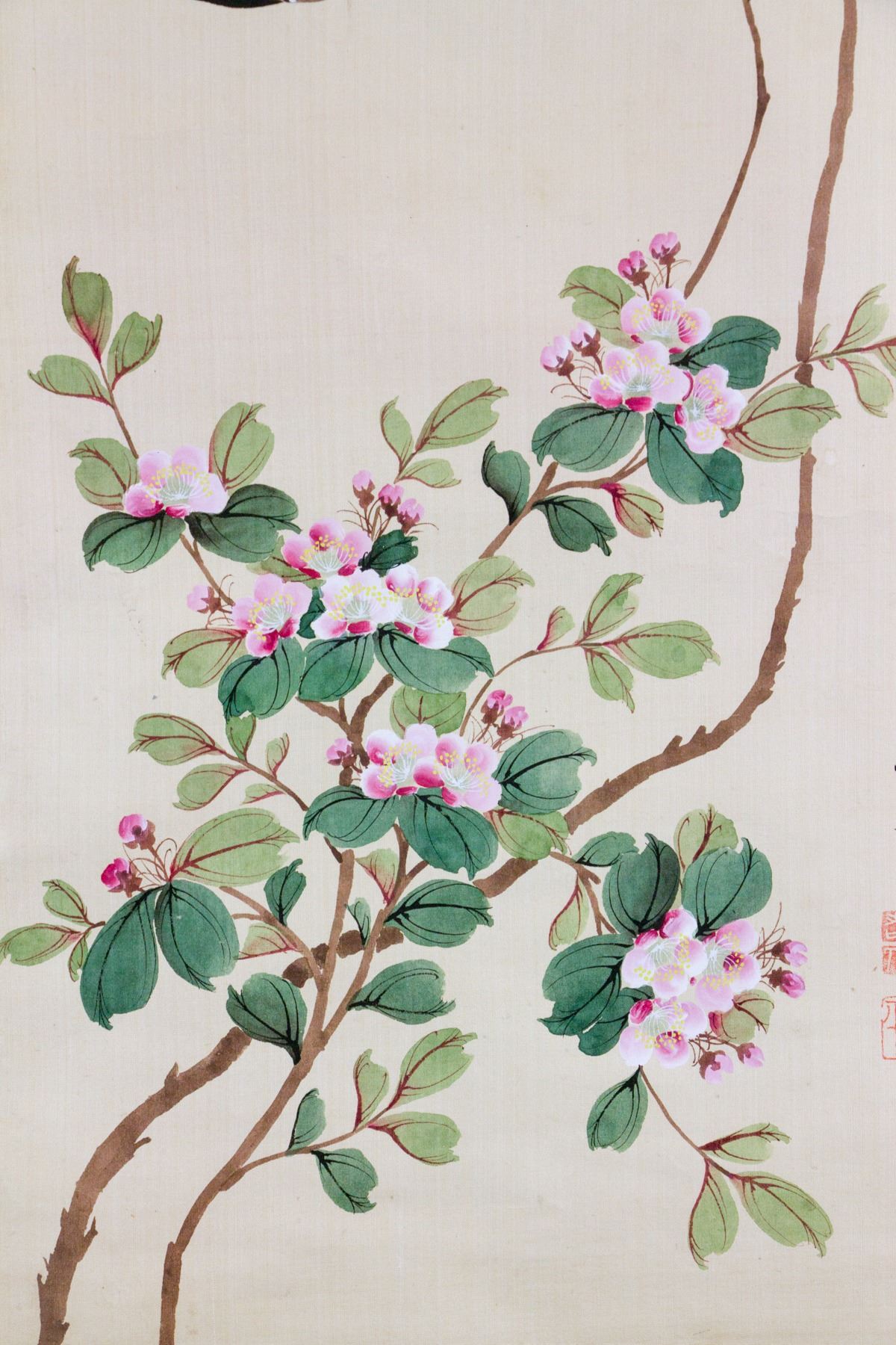Ink and watercolor on silk, hanging scroll. Featuring birds perching on prunus blossom branch. Signed Yun Shouping 1633-1690 Chinese, inscribed with 2 artist seals. 129 × 36 cm
