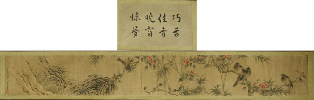 Birds perching on peony branches; Chinese ink and watercolour on paper; signed Yun Shouping and inscribed with one artist seal; 393 cm × 33 cm