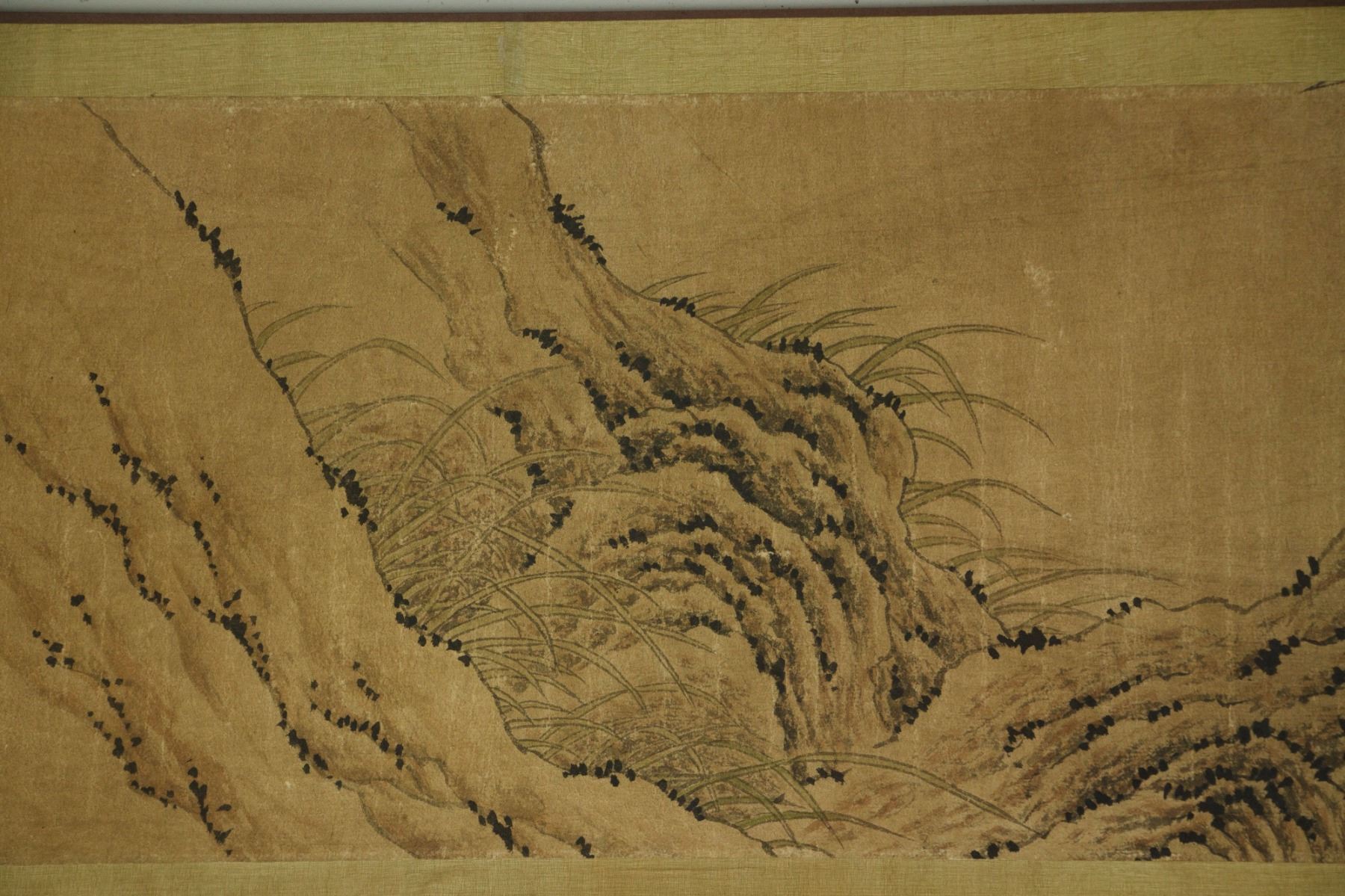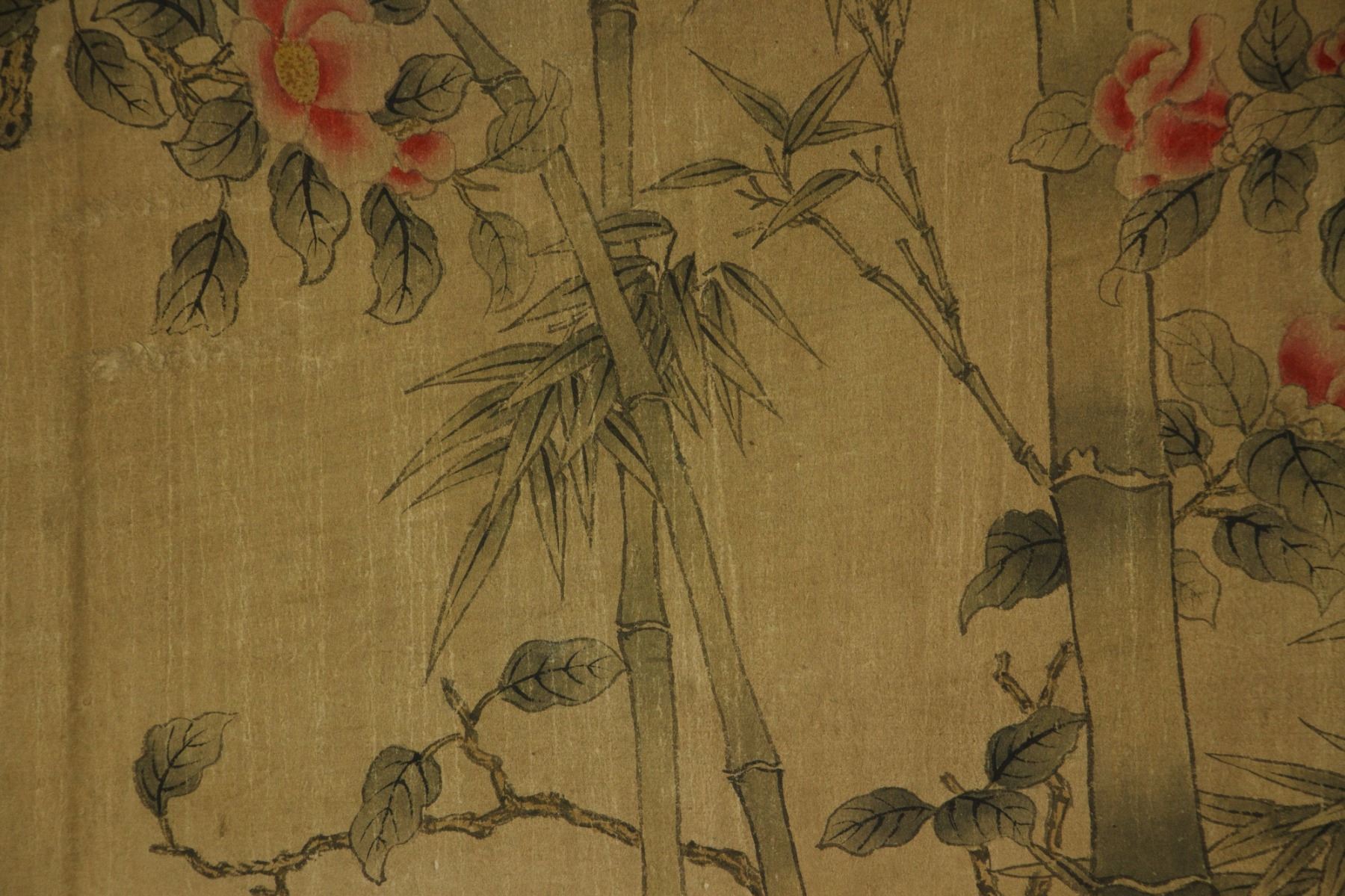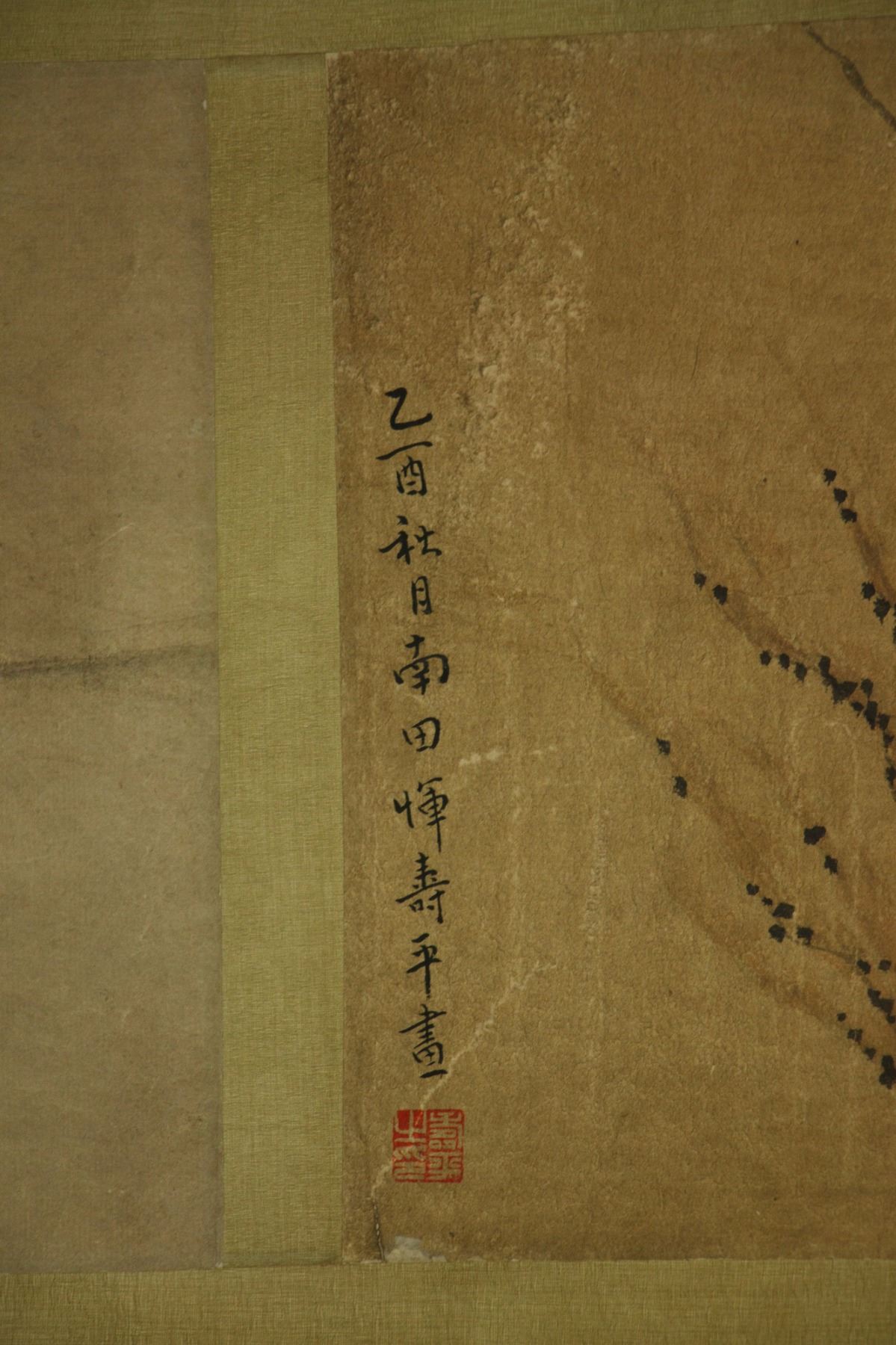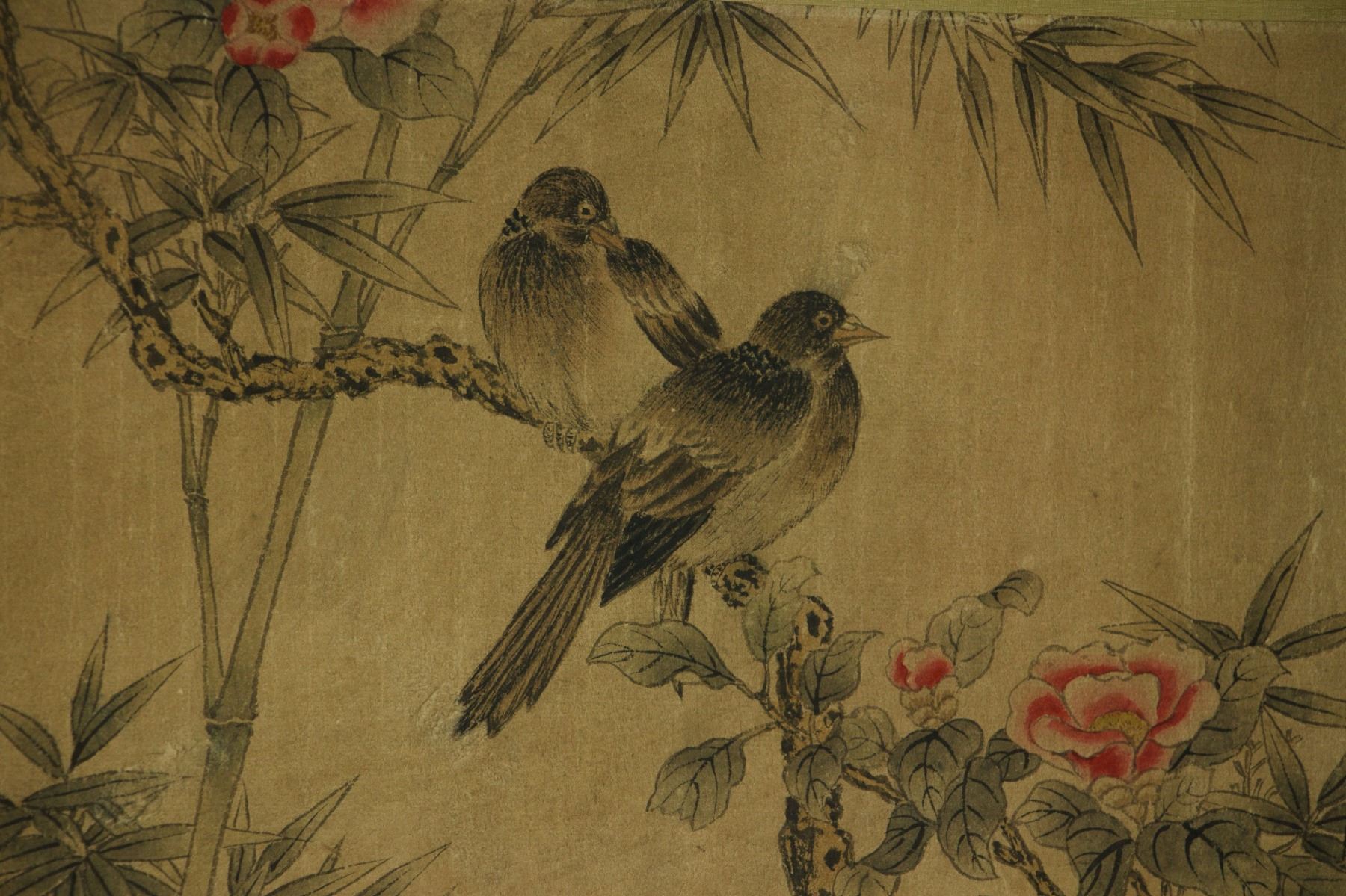Birds perching on peony branches; Chinese ink and watercolour on paper; signed Yun Shouping and inscribed with one artist seal; 393 cm × 33 cm