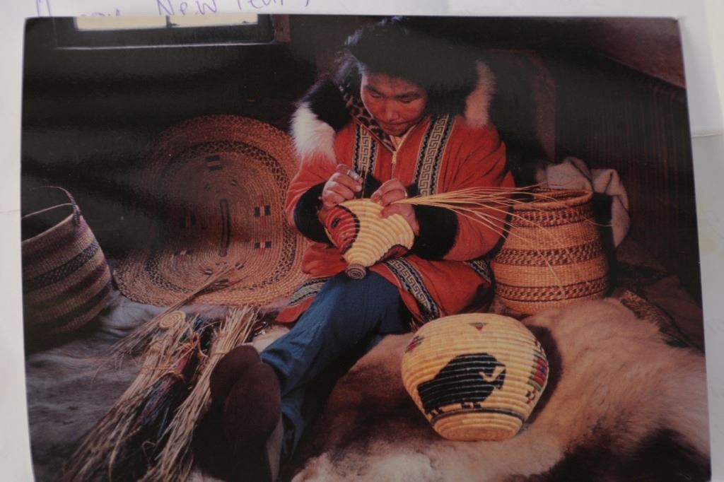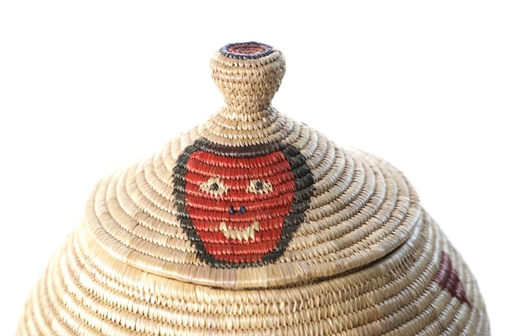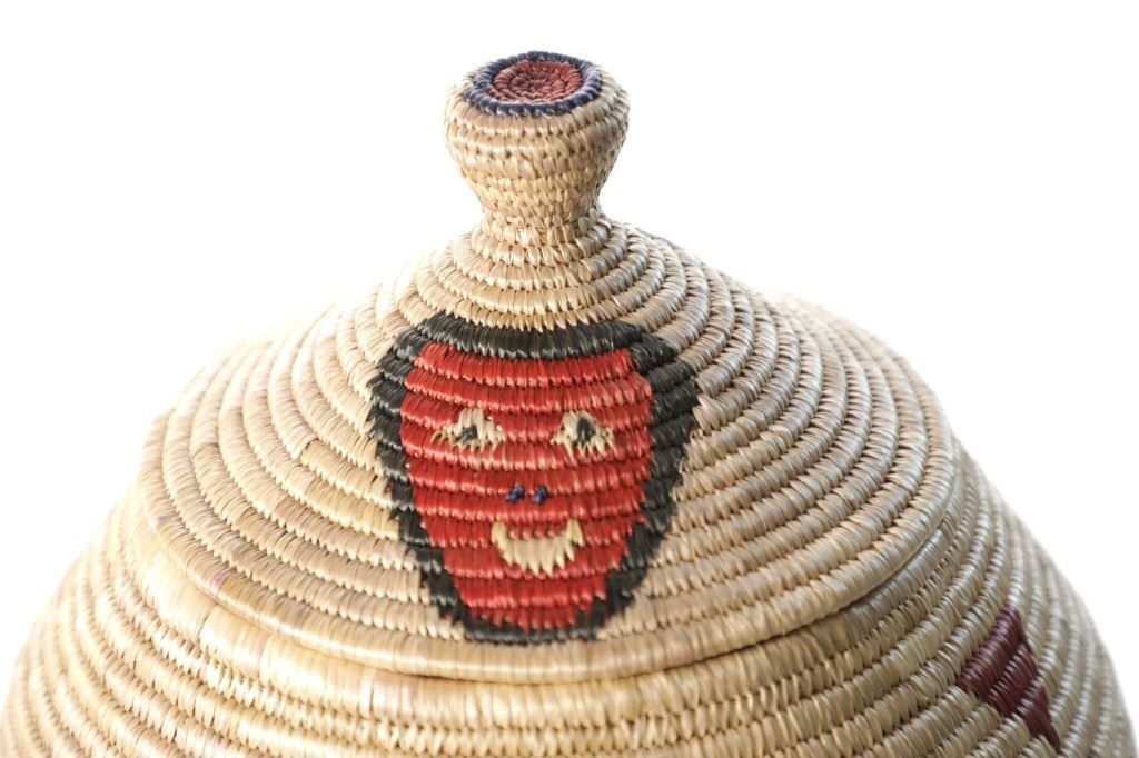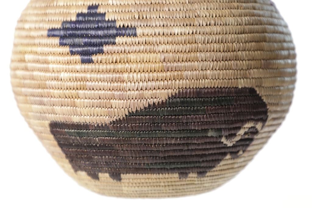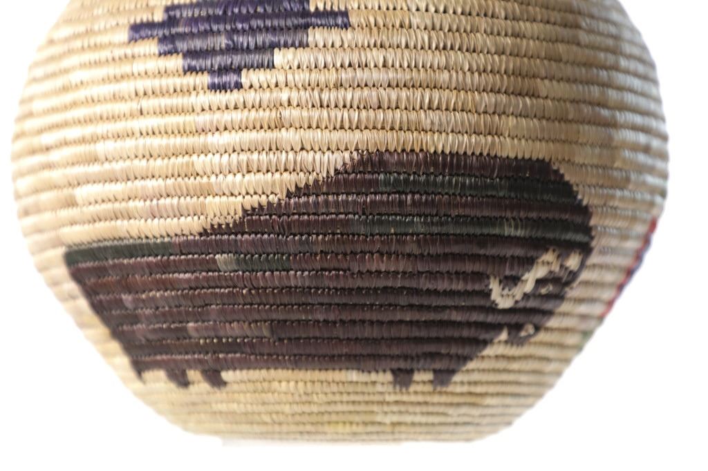 This is an astounding, large coiled grass lidded basket by Eskimo-Aleut Yupik artist, Nacy Edwards from Nunivak Island. The piece is accompanied by a postcard photograph of Nancy Edwards weaving another very similar Musk Ox lidded basket and is marked on the back Nunivak Nancy Edwards Musk Ox Basket $800.00 December 21, 2002, the postcard is copyrighted 1990. There is also a hand written letter from Dan Paynich of Great Falls, Montana inquiring about collecting another basket (presumably this basket) from Nancy, with a reply on the the back stating she is still crafted baskets, for $1,200 a piece, and will resume making after having her eyes checked in Anchorage, Alaska. There is a Nancy Edwards Nunivak basket in the collection of the British Museum Am1992,05.51.a-b from circa 1992 Mekoryuk collected by Jonathan C.H. King. It notes that Mrs. Edwards said she invented the overlay technique with beach grasses herself. The basket shows a large coiled hand woven beach grass fine example with two Musk Ox effigy figures, one on each side, done in deep purple and green dyes. The basket body also shows two stepped symbols in dark blue, two purple triangles and two geometric patterns showing a green cross below and above a red square with dark blue inside. The baskets perfectly fitted lid Shows a dark blue and maroon / purple top with two mask human faces with black borders, red faces and natural and black features. The basket is in truly fine well kept condition. Measures overall 12.75"H by 11.5" across / diameter. Total weight of 1lbs 4oz.