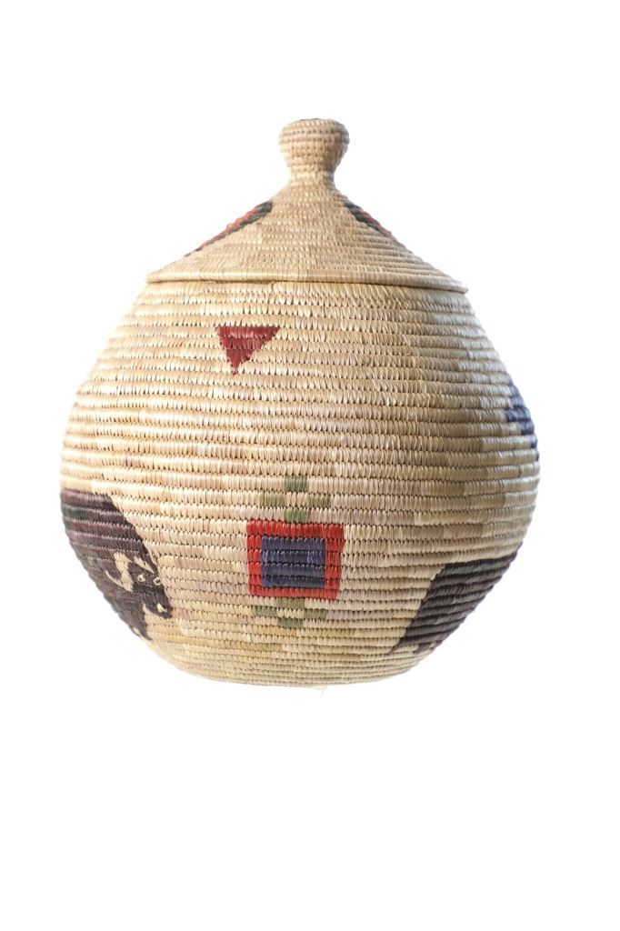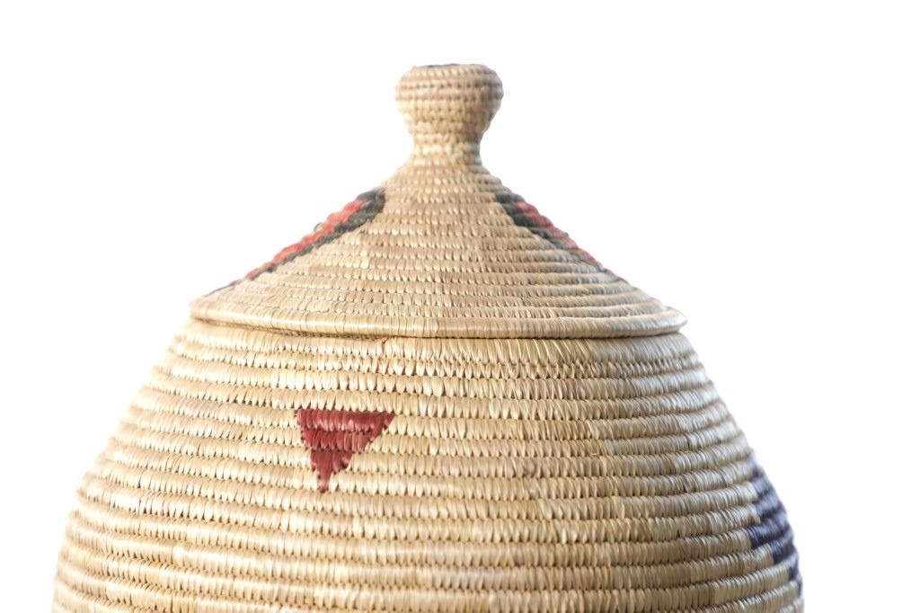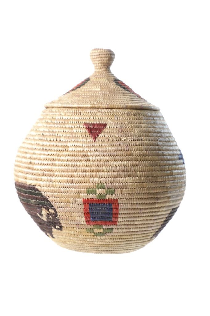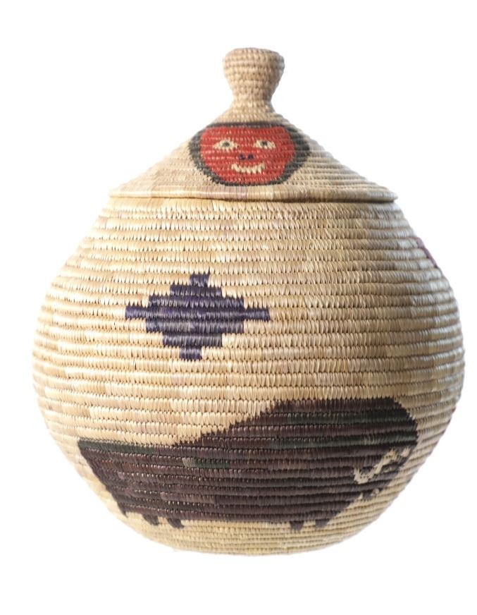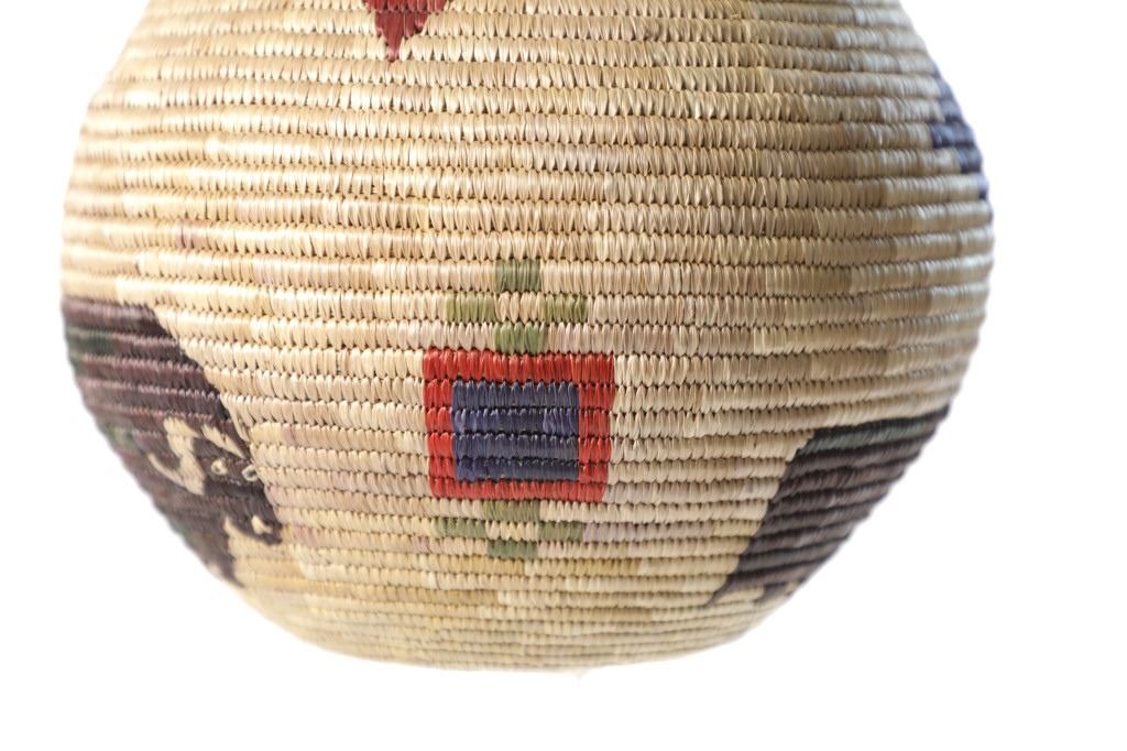 This is an astounding, large coiled grass lidded basket by Eskimo-Aleut Yupik artist, Nacy Edwards from Nunivak Island. The piece is accompanied by a postcard photograph of Nancy Edwards weaving another very similar Musk Ox lidded basket and is marked on the back Nunivak Nancy Edwards Musk Ox Basket $800.00 December 21, 2002, the postcard is copyrighted 1990. There is also a hand written letter from Dan Paynich of Great Falls, Montana inquiring about collecting another basket (presumably this basket) from Nancy, with a reply on the the back stating she is still crafted baskets, for $1,200 a piece, and will resume making after having her eyes checked in Anchorage, Alaska. There is a Nancy Edwards Nunivak basket in the collection of the British Museum Am1992,05.51.a-b from circa 1992 Mekoryuk collected by Jonathan C.H. King. It notes that Mrs. Edwards said she invented the overlay technique with beach grasses herself. The basket shows a large coiled hand woven beach grass fine example with two Musk Ox effigy figures, one on each side, done in deep purple and green dyes. The basket body also shows two stepped symbols in dark blue, two purple triangles and two geometric patterns showing a green cross below and above a red square with dark blue inside. The baskets perfectly fitted lid Shows a dark blue and maroon / purple top with two mask human faces with black borders, red faces and natural and black features. The basket is in truly fine well kept condition. Measures overall 12.75"H by 11.5" across / diameter. Total weight of 1lbs 4oz.