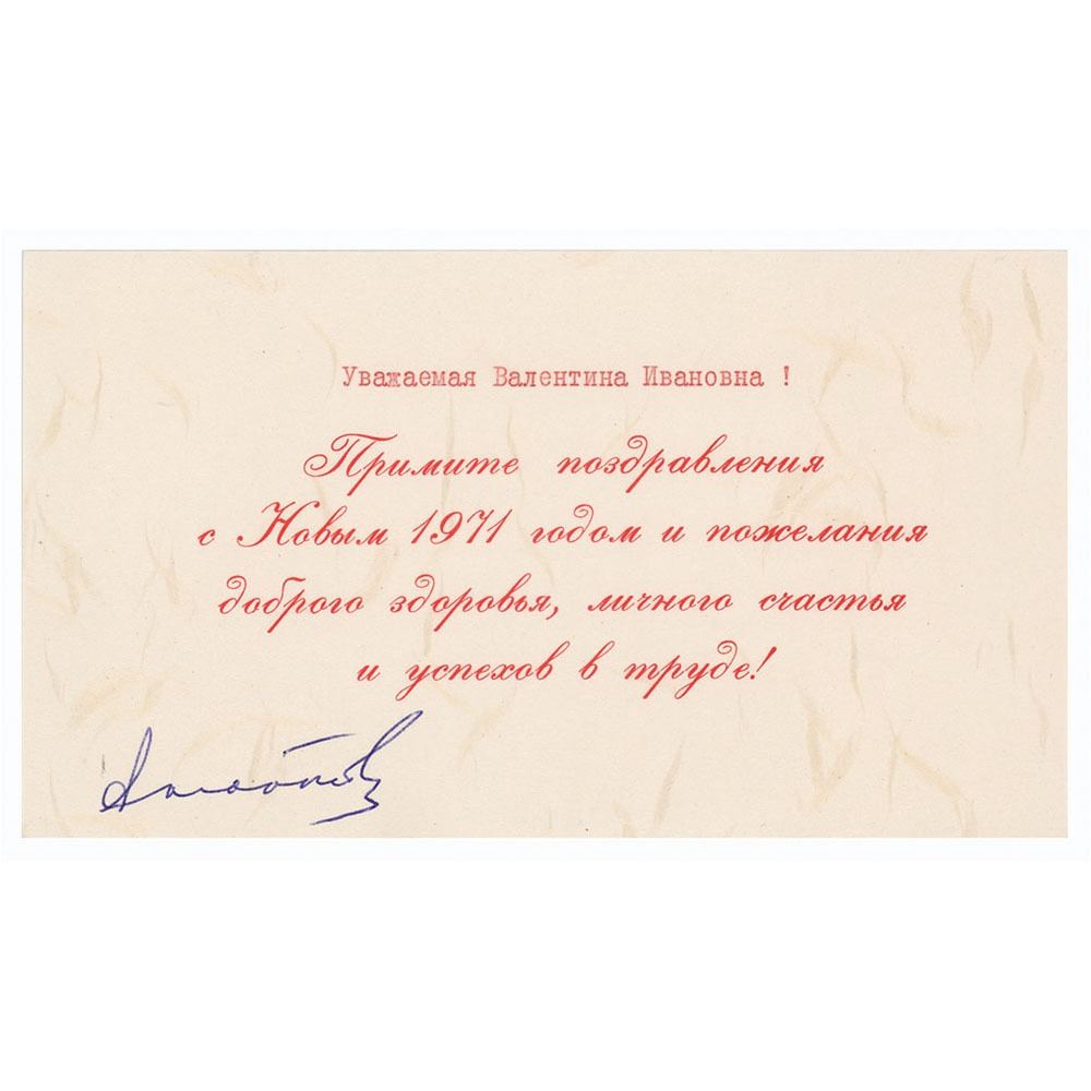 Russian greeting card slip sent to Valentina Ivanov for the 1971 New Year, 7 x 4, signed in blue ballpoint by Yuri Andropov. In very fine condition.