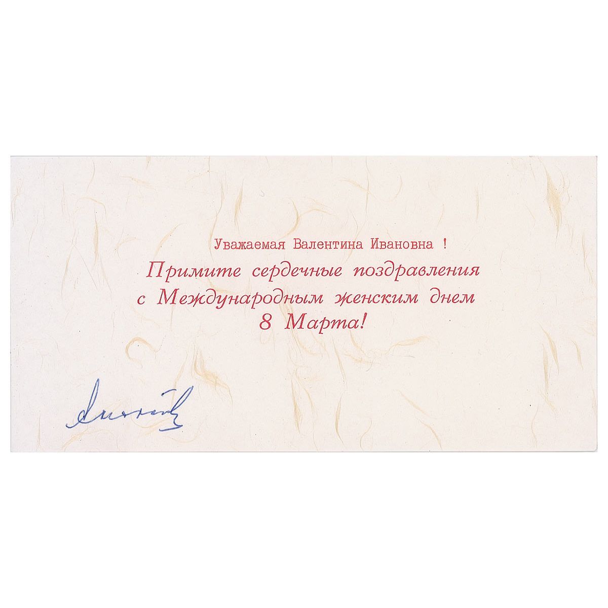 Appointed KGB chief in 1967, he became a full member of the Politburo in 1973. His firm handling of dissident movements enhanced his reputation, enabling him to be chosen as Brezhnev's successor in 1983, but he died after less than 15 months in office. Greeting card, 7.75 x 4, with a Russian sentiment printed on the front, signed in blue ballpoint on the front. In fine condition, with light creasing to the bottom right corner.