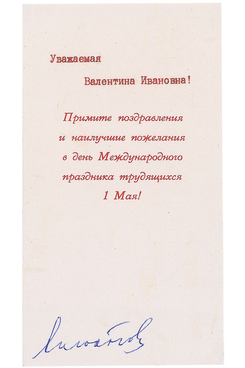 Appointed KGB chief in 1967, he became a full member of the Politburo in 1973. His firm handling of dissident movements enhanced his reputation, enabling him to be chosen as Brezhnev's successor in 1983, but he died after less than 15 months in office. Greeting card, 3.5 x 6.5, bearing a printed Russian sentiment, and signed in blue ballpoint. In fine condition.
