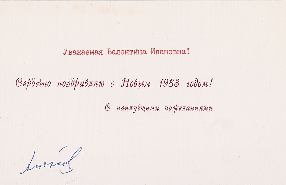 Appointed KGB chief in 1967, he became a full member of the Politburo in 1973. His firm handling of dissident movements enhanced his reputation, enabling him to be chosen as Brezhnev's successor in 1983, but he died after less than 15 months in office. New Year’s card for 1983, 6.75 x 4.25, bearing a printed Russian sentiment, signed in the lower left in blue ballpoint. In fine condition.
