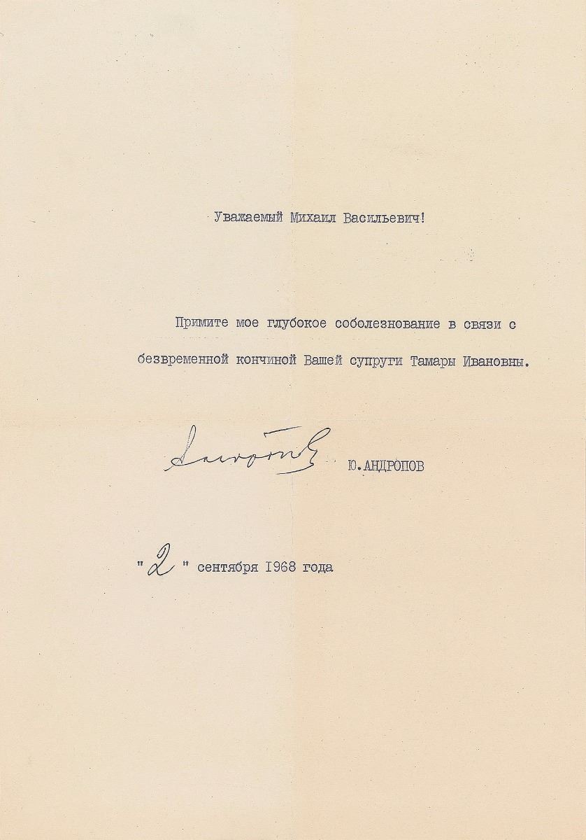 Soviet politician (1914–1984) named chairman of the KGB from 1967, where his firm handling of dissident movements enhanced his reputation and enabled him to be chosen as Brezhnev's successor in 1983; he died after less than 15 months in office. TLS in Cyrillic, signed “Y. Andropov,” one page, 8 x 11.25, October 2, 1968. Letter to Mikhail Vasilyevich. In full (translated): "Please accept my condolences on the premature passing of your wife Tamara Ivanovna.” In fine condition.