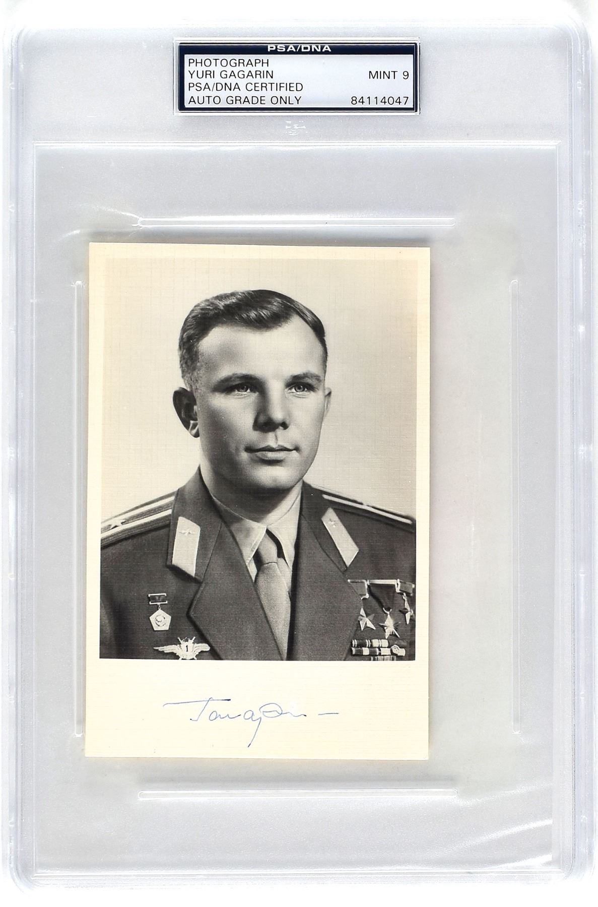 Textured matte-finish 3.75 x 5.75 photo of Gagarin in uniform, boldly signed in the lower border in fountain pen. In very fine condition. Encapsulated by PSA/DNA, with the autograph graded MINT 9.