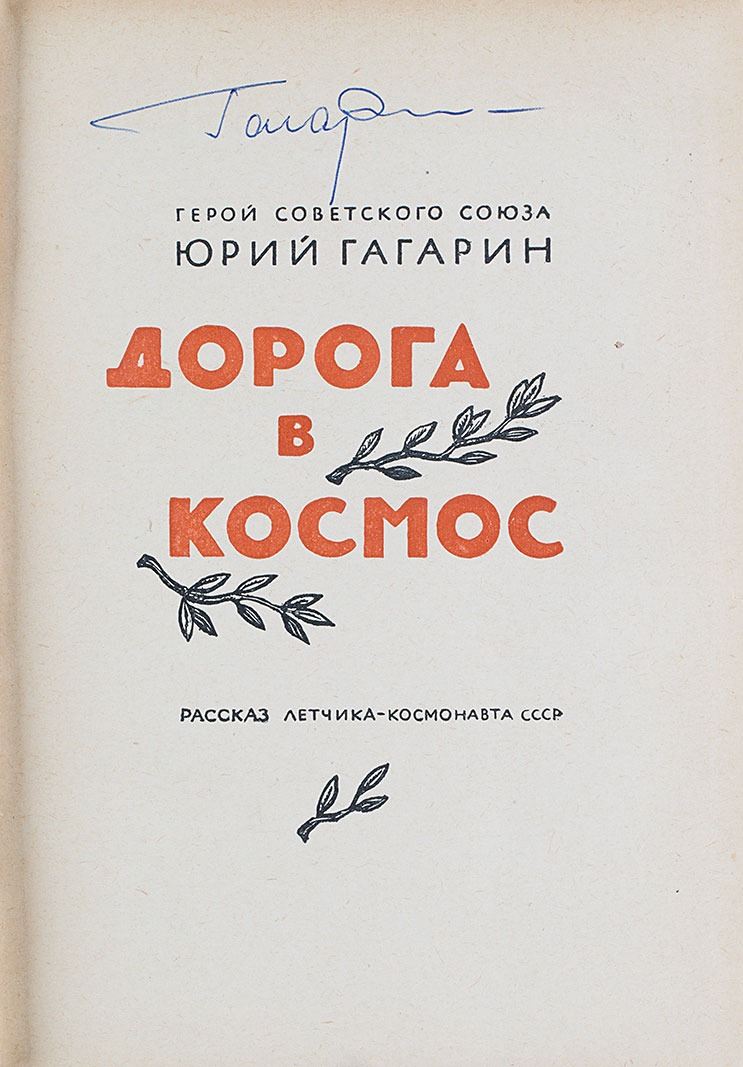 Signed book in Cyrillic: Road to Space. Moscow: Children Literature, Ministry of Education of Russian Soviet Union Federation, 1963. Hardcover with dust jacket, 6 x 8.25, 304 pages. Signed on the title page in blue ballpoint by Gagarin. In fine condition, with toning to inner pages, and some wear to the dust jacket.