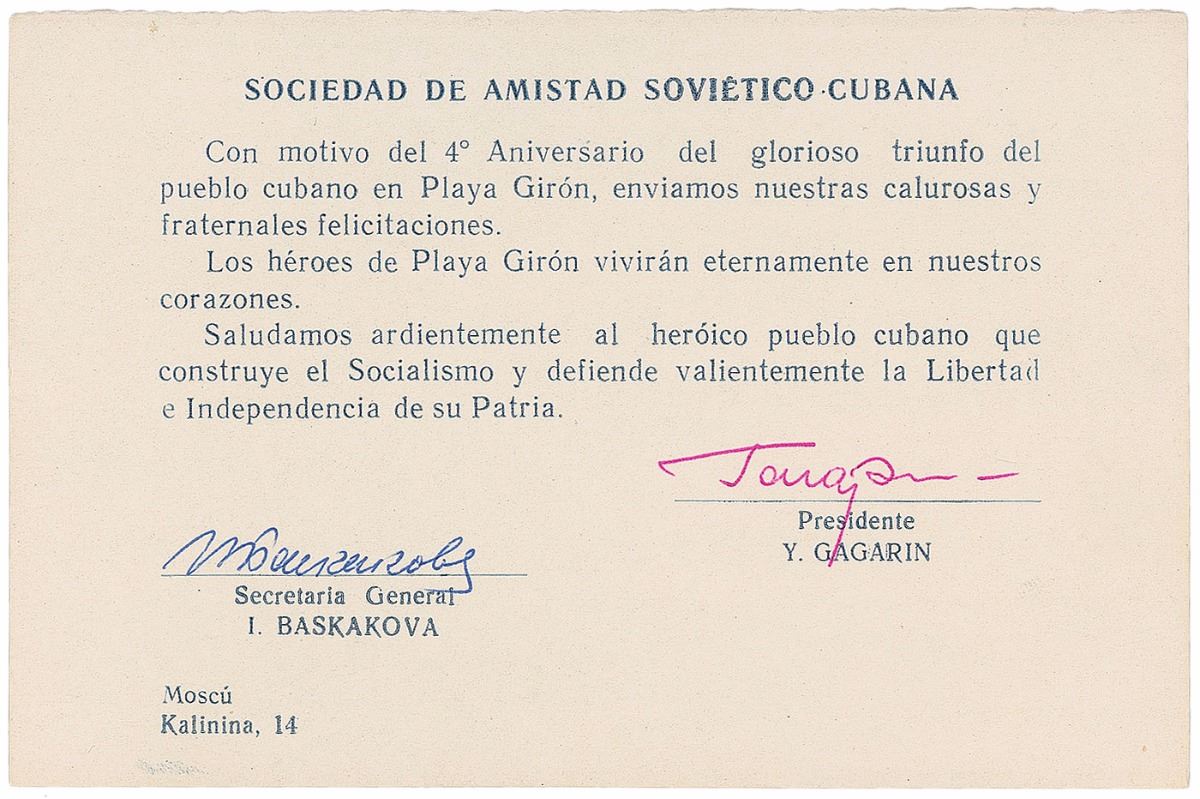 DS in Spanish, one page, 5.75 x 3.75, no date [1965]. Entitled “Sociedad De Amistad Sovietico-Cubano [Cuban–Soviet Friendship Society],” the document reads, in full (translated): “To mark the fourth anniversary of the glorious triumph of the Cuban people in Playa Giron, we send our warm and fraternal greetings. The heroes of Playa Giron will live forever in our hearts. We ardently salute the heroic Cuban people who build socialism and courageously defend the freedom and independence of their homeland.” Signed at the conclusion in red ink by Gagarin and countersigned by the secretary general. In fine condition. The Leon Ford Collection.