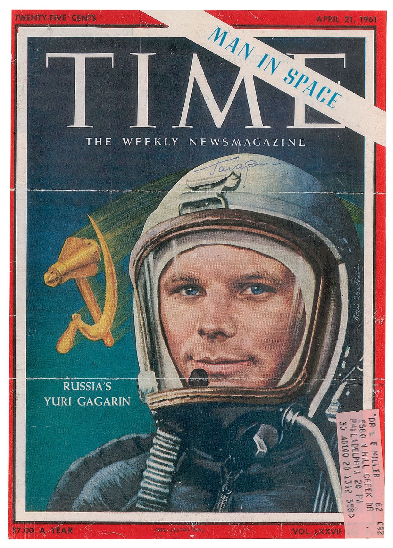Time Magazine cover from April 21, 1961, recognizing Gagarin's historic first manned spaceflight, 7.5 x 10.75, signed in ink in Cyrillic. In very good to fine condition, with trimmed edges, light creasing, and two mailing folds.