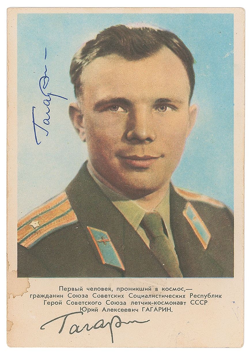 Appealing Russian-language color 4.25 x 6 postcard photo of legendary cosmonaut Yuri Gagarin in his military uniform, signed vertically in blue ballpoint. Lower border features a preprinted facsimile signature. In fine condition, with two stains to the lower left side.