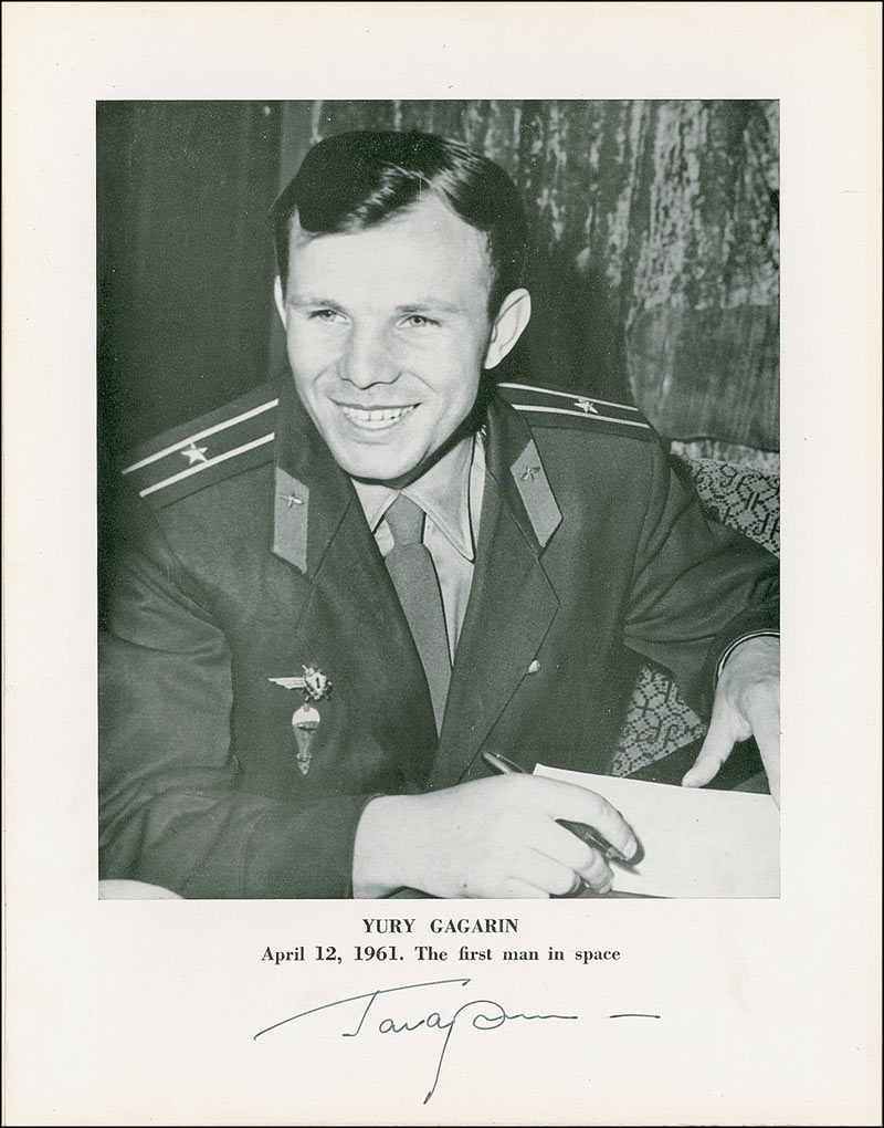 Vintage matte-finish 8.5 x 11 photo of Gagarin in uniform, signed in black felt tip at the lower white border. Affixed to a same-size piece of cardstock. In fine condition, with faint edge toning and a few surface marks.