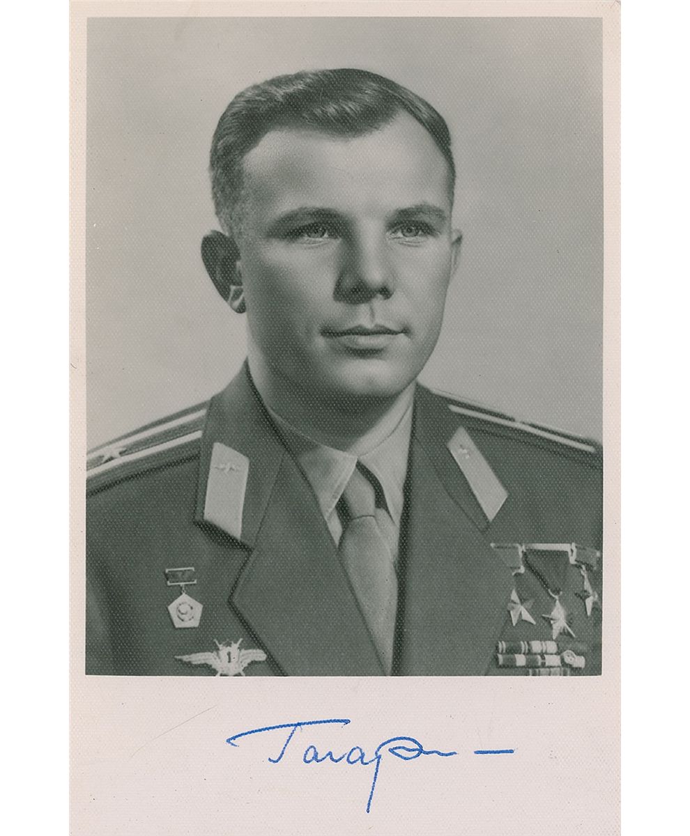 Vintage 3.75 x 5.75 postcard photo of Gagarin wearing numerous medals, signed in the lower border in blue ballpoint. In fine condition.