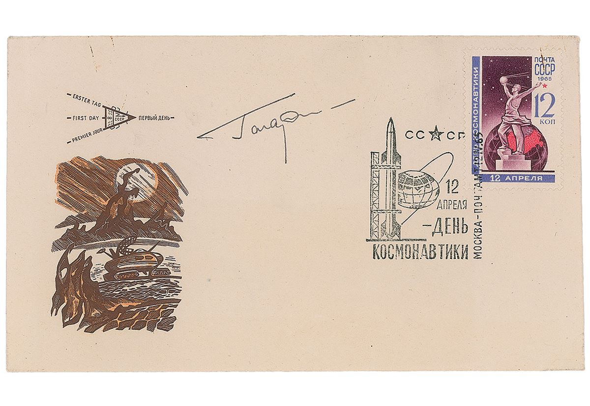 FDC, 6.25 x 3.75, with a cachet depicting a stylized lunar rover, signed in black ballpoint. In fine condition, with a light rusty paperclip impression to top edge.