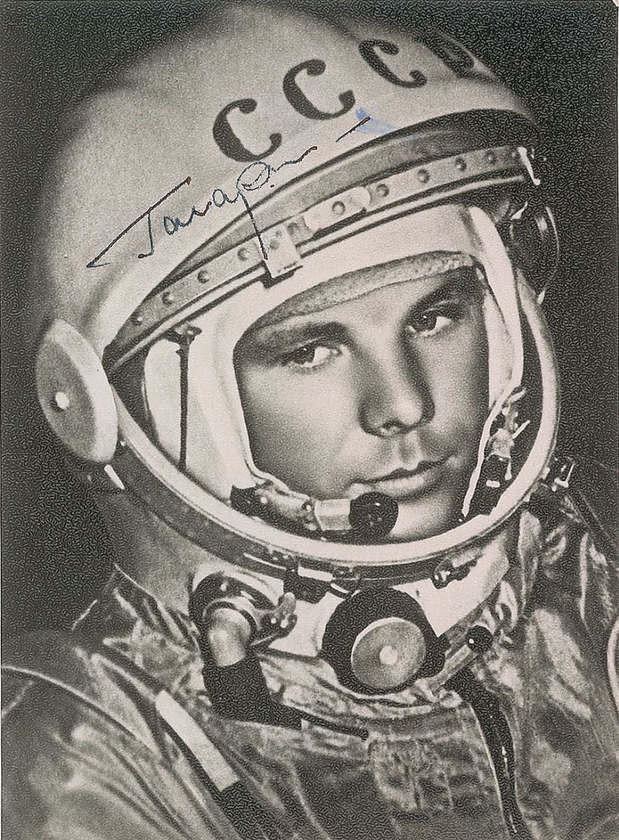 Matte-finish 3.5 x 4.75 head-and-shoulders photo of Gagarin in uniform, signed in blue ink. In fine condition, with a brush to the end of the signature and a ding to upper right corner tip. Accompanied by a full letter of authenticity from JSA.