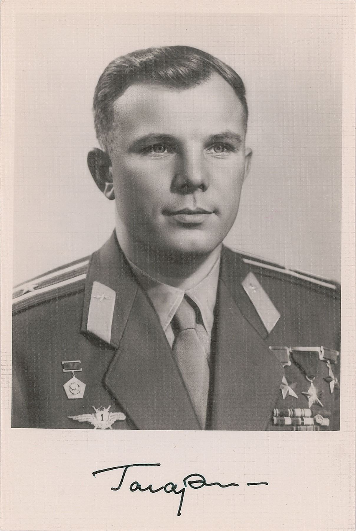 Textured matte-finish 3.75 x 5.75 photo of Gagarin in uniform, boldly signed in the lower border in fountain pen. In very fine condition.
