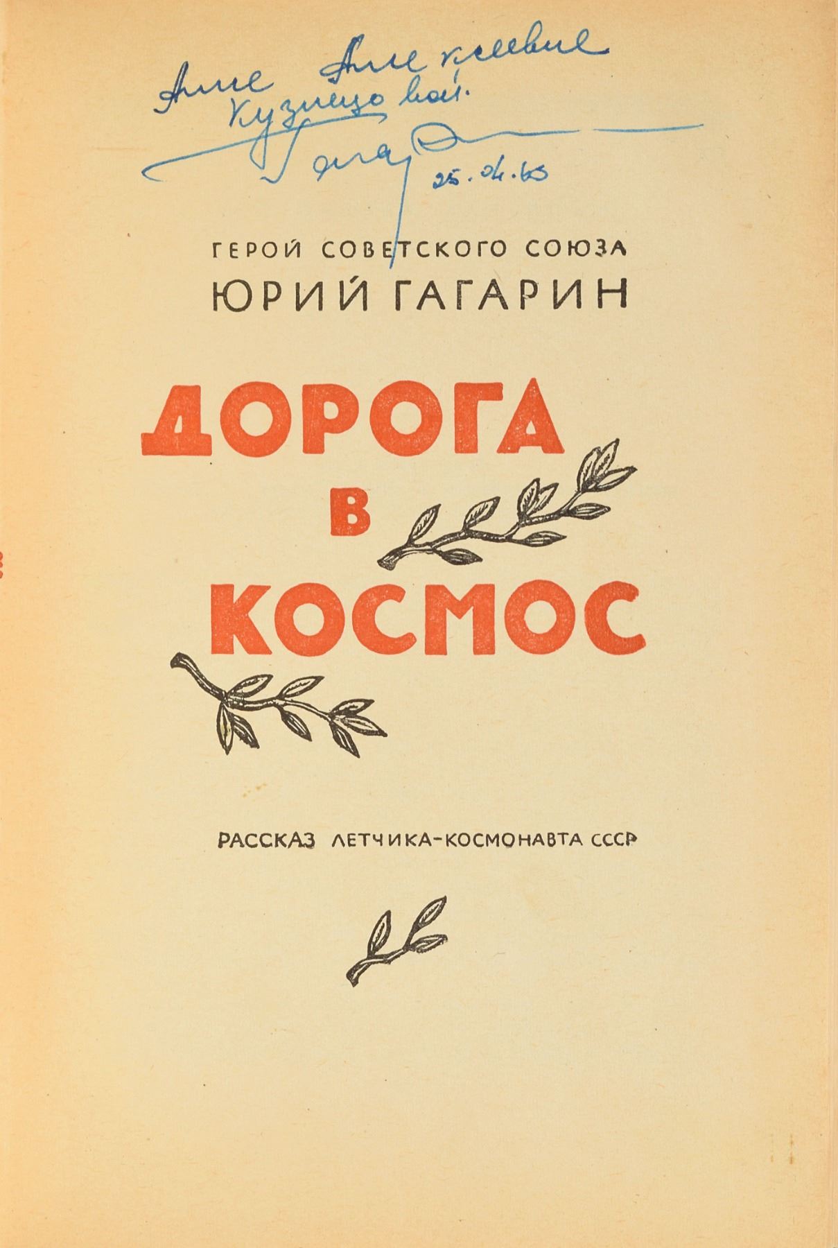 Signed book in Cyrillic: The Road to Space. Moscow: Pravda, 1963. Hardcover, 6 x 8, 304 pages. Signed and inscribed on the title page in blue ink by Gagarin, who adds the date: "25. 04. 63." In fine condition, with light soiling and staining to the covers.