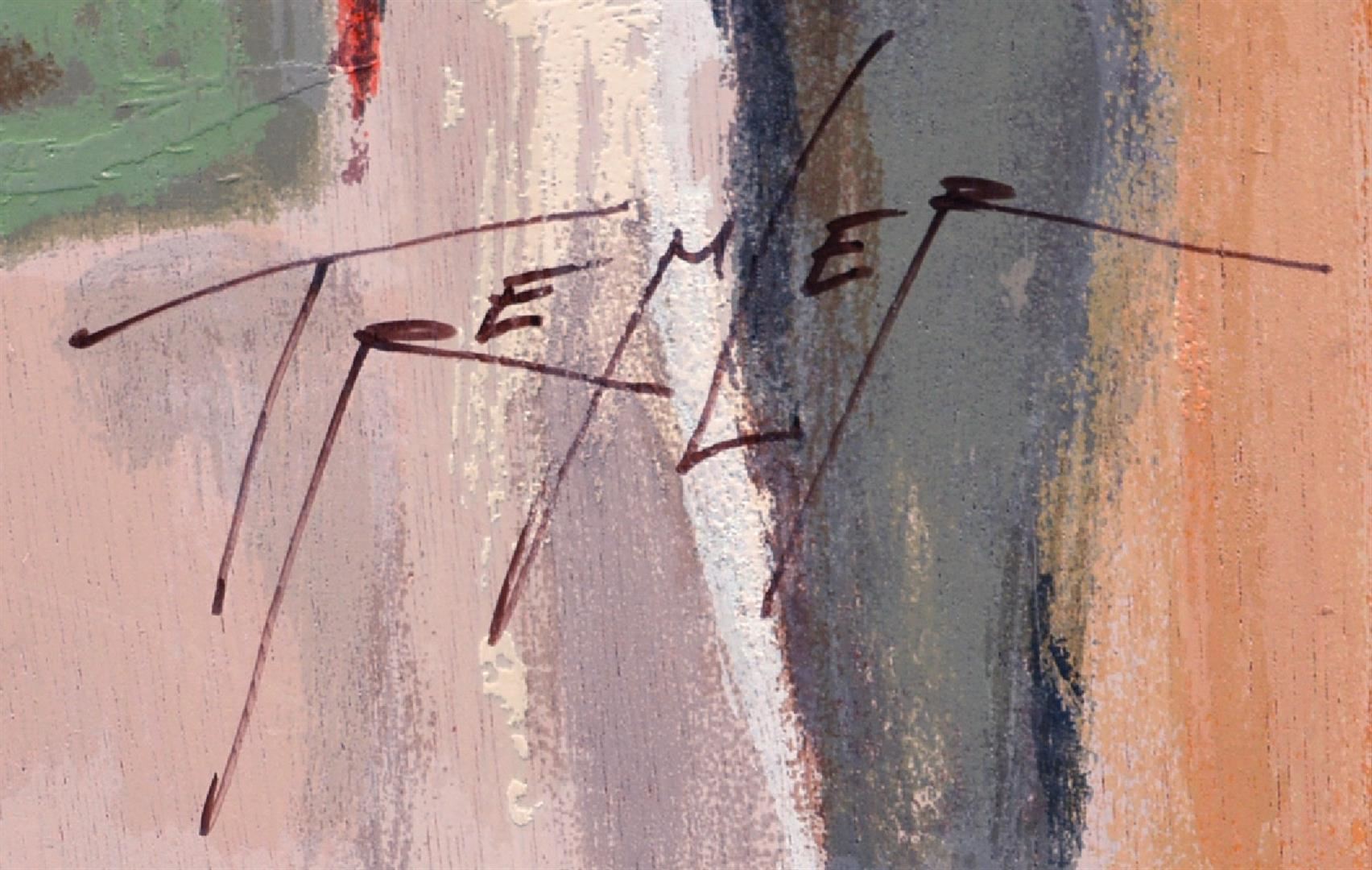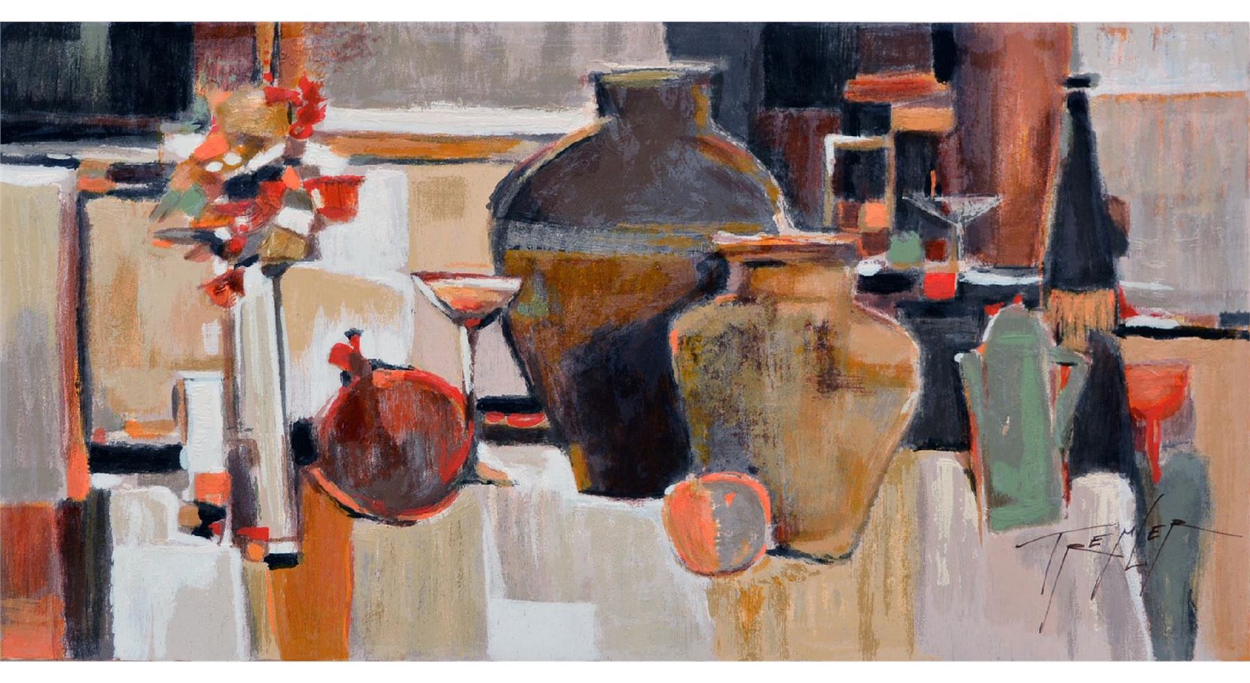 Artist: Yuri Tremler - Title: Amphora - Medium: Serigraph on Fine Art Wood - Signature: Hand-signed by the Artist - Limited Edition: HC 60 - Image Size: Approximately 12.5 inches x 22.5 inches - Unframed - Details: This work comes with a Certificate of Authenticity - Yuri's art reminds us of sudden still-life, left after an intimate party, of time spent with friends, or shared past which still excites. Sometimes whimsical, sometimes nostalgic, Tremler's art reaches inward to basic emotions of humanity.