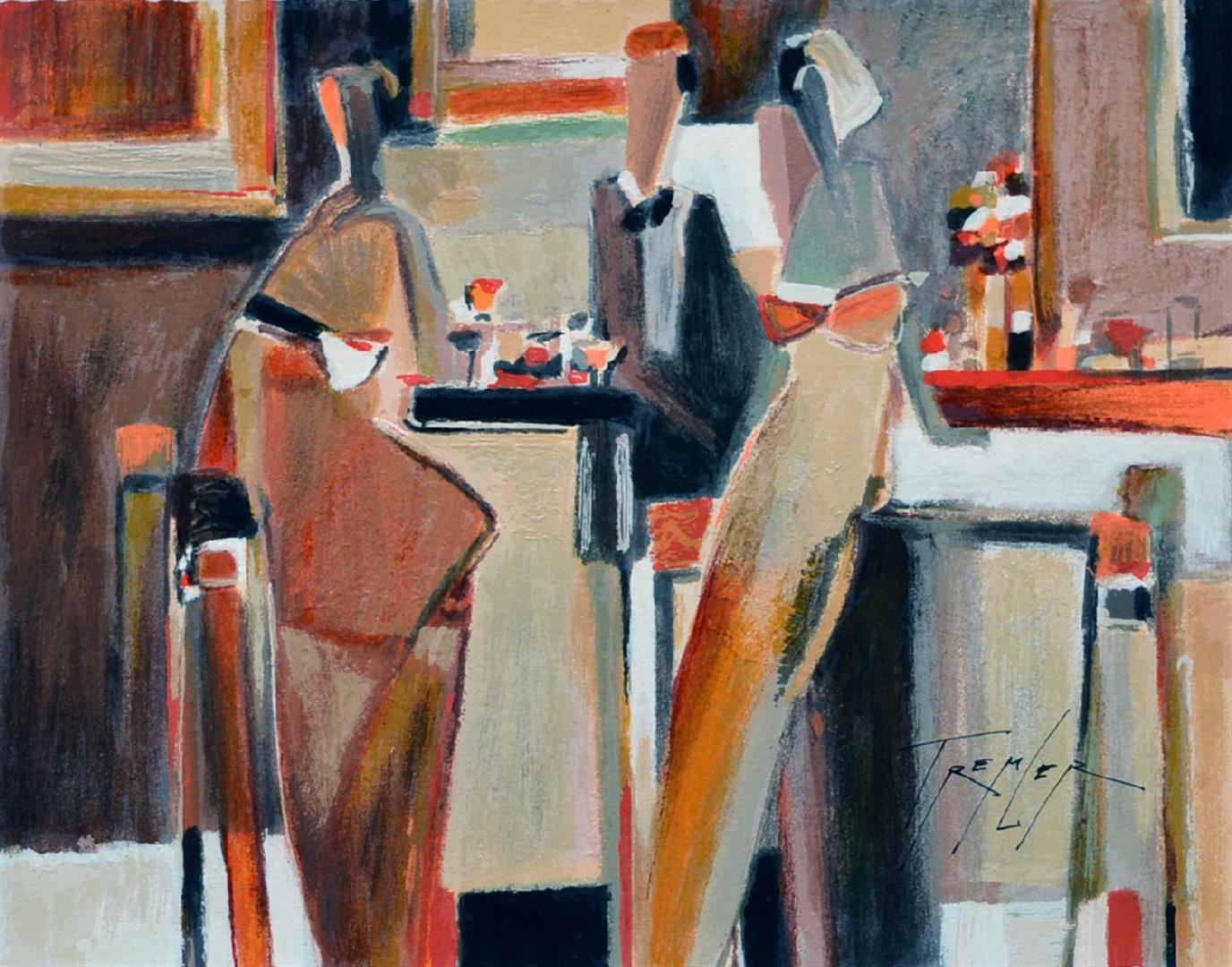 Artist: Yuri Tremler - Title: Bar Scene I - Medium: Serigraph on Fine Art Paper - Signature: Hand-signed by the Artist - Limited Edition: 490 - Image Size: Approximately 12 inches x 15 inches - Paper Size: Approximately 13.5 inches x 16.5 inches - Framed: Unframed - Details: This work comes with a Certificate of Authenticity - Yuri's art reminds us of sudden still-life, left after an intimate party, of time spent with friends, or shared past which still excites. Sometimes whimsical, sometimes nostalgic, Tremler's art reaches inward to basic emotions of humanity.