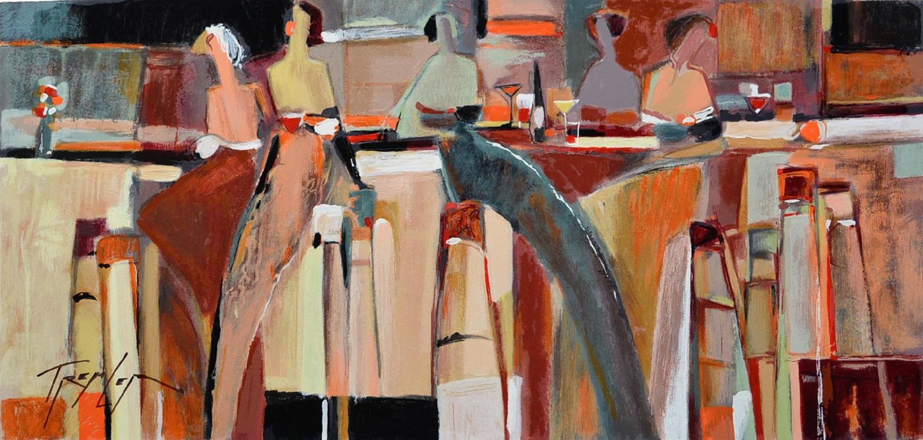 Artist: Yuri Tremler - Title: Girlfriends - Medium: Serigraph on Fine Art Paper - Signature: Hand-signed by the Artist - Limited Edition: 480 - Image Size: Approximately 16 inches x 34 inches - Paper Size: Approximately 17.75 inches x 35.75 inches - Unframed - Details: This work comes with a Certificate of Authenticity - Yuri's art reminds us of sudden still-life, left after an intimate party, of time spent with friends, or shared past which still excites. Sometimes whimsical, sometimes nostalgic, Tremler's art reaches inward to basic emotions of humanity.