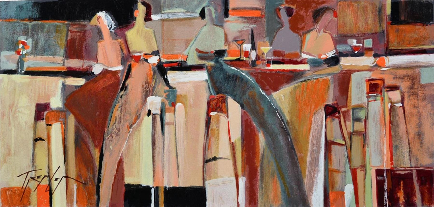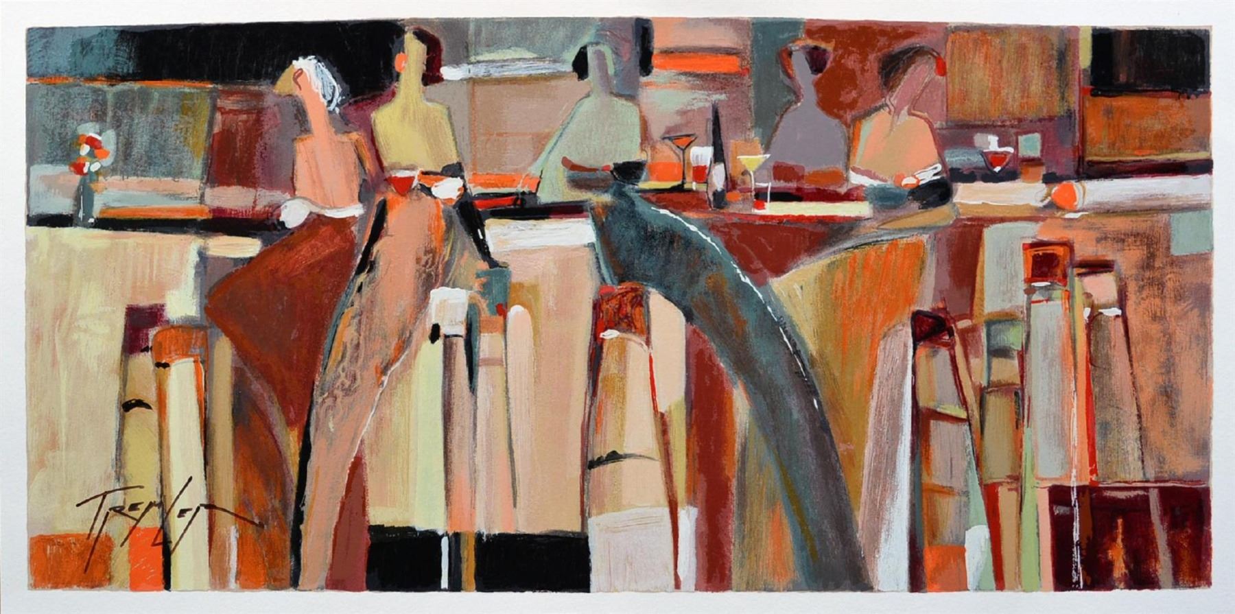 Artist: Yuri Tremler - Title: Girlfriends - Medium: Serigraph on Fine Art Paper - Signature: Hand-signed by the Artist - Limited Edition: 480 - Image Size: Approximately 16 inches x 34 inches - Paper Size: Approximately 17.75 inches x 35.75 inches - Unframed - Details: This work comes with a Certificate of Authenticity - Yuri's art reminds us of sudden still-life, left after an intimate party, of time spent with friends, or shared past which still excites. Sometimes whimsical, sometimes nostalgic, Tremler's art reaches inward to basic emotions of humanity.