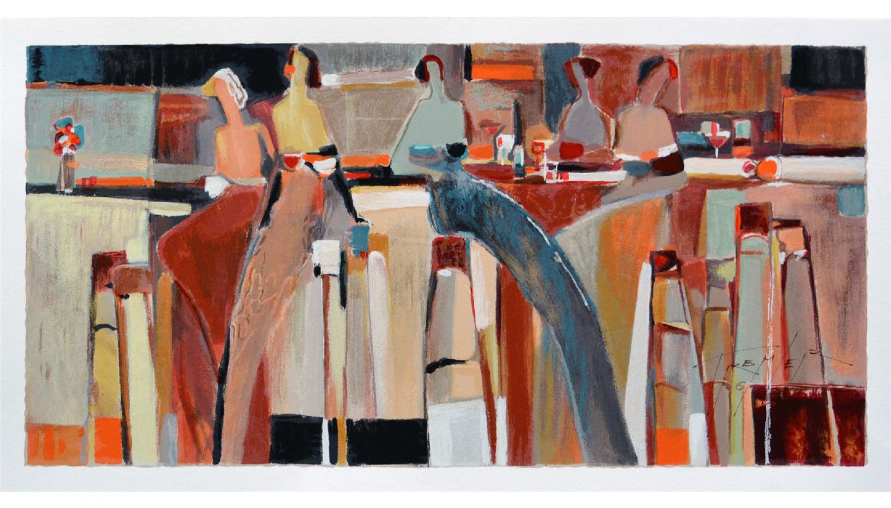 Artist: Yuri Tremler - Title: Intermezzo - Medium: Serigraph on Fine Art Paper - Signature: Hand-signed by the Artist - Limited Edition: 480 - Image Size: Approximately 12 inches x 24 inches - Paper Size: Approximately 13.5 inches x 26 inches - Unframed - Details: This work comes with a Certificate of Authenticity - Yuri's art reminds us of sudden still-life, left after an intimate party, of time spent with friends, or shared past which still excites. Sometimes whimsical, sometimes nostalgic, Tremler's art reaches inward to basic emotions of humanity.