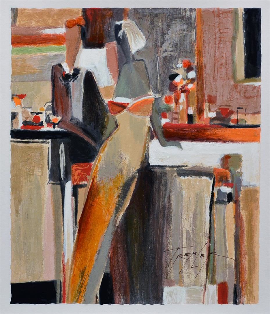 Artist: Yuri Tremler - Title: Matinee I - Medium: Serigraph on Fine Art Paper - Signature: Hand-signed by the Artist - Limited Edition: 490 - Image Size: Approximately 15 inches x 12 inches - Paper Size: Approximately 16.5 inches x 13.25 inches - Unframed - Details: This work comes with a Certificate of Authenticity - Yuri's art reminds us of sudden still-life, left after an intimate party, of time spent with friends, or shared past which still excites. Sometimes whimsical, sometimes nostalgic, Tremler's art reaches inward to basic emotions of humanity.