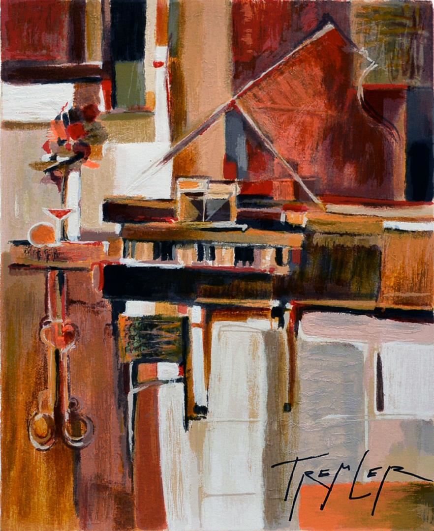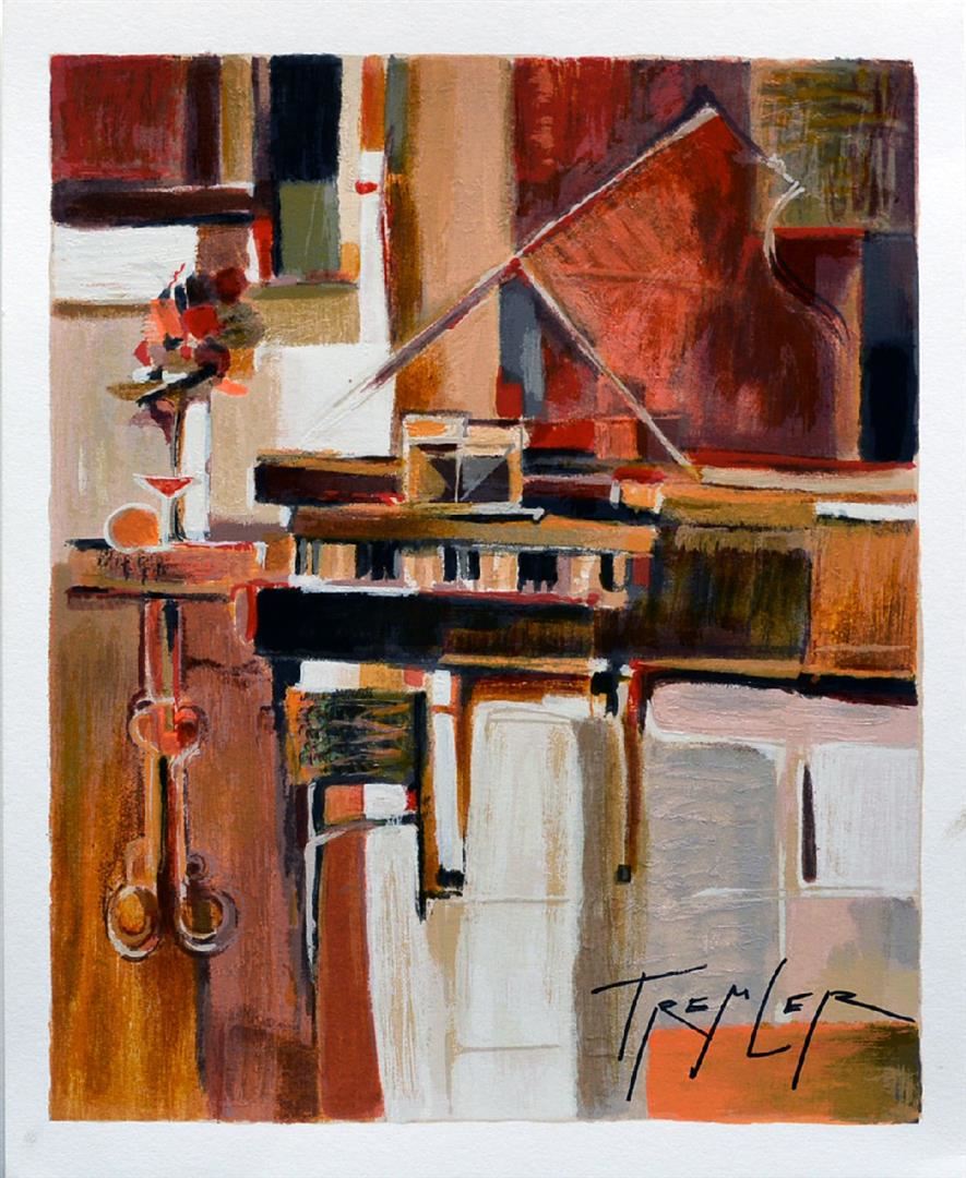 Artist: Yuri Tremler - Title: Piano - Medium: Serigraph on Fine Art Paper - Signature: Hand-signed by the Artist - Limited Edition: 490 - Image Size: Approximately 15 inches x 12 inches - Paper Size: Approximately 16.5 inches x 13.5 inches - Framed: Unframed - Details: This work comes with a Certificate of Authenticity - Yuri's art reminds us of sudden still-life, left after an intimate party, of time spent with friends, or shared past which still excites. Sometimes whimsical, sometimes nostalgic, Tremler's art reaches inward to basic emotions of humanity.