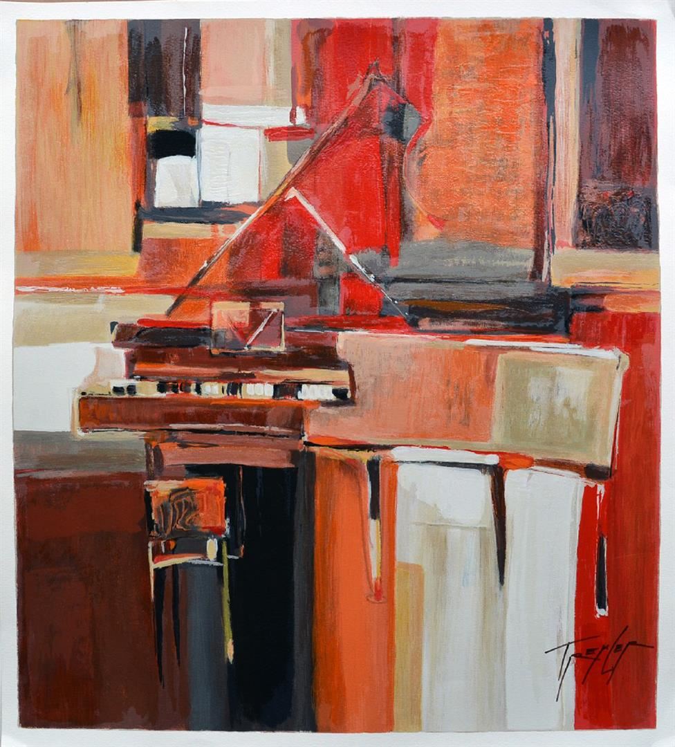 Artist: Yuri Tremler - Title: Piano in Red - Medium: Serigraph on Fine Art Paper - Signature: Hand-signed by the Artist - Limited Edition: 480 - Image Size: Approximately 31 inches x 28 inches - Paper Size: Approximately 32.25 inches x 29.25 inches - Framed: Unframed - Details: This work comes with a Certificate of Authenticity - Yuri's art reminds us of sudden still-life, left after an intimate party, of time spent with friends, or shared past which still excites. Sometimes whimsical, sometimes nostalgic, Tremler's art reaches inward to basic emotions of humanity.