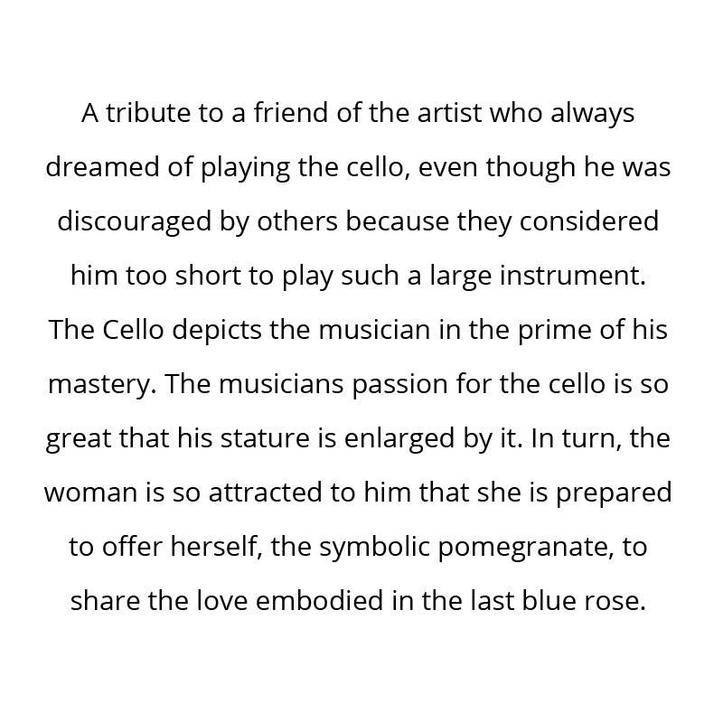 "The Cello" is a limited edition serigraph on canvas by Yruoz. The piece is hand signed by the artist, numbered, and accompanied by a certificate of authenticity. Measures approximately 48" x 32" (image).
