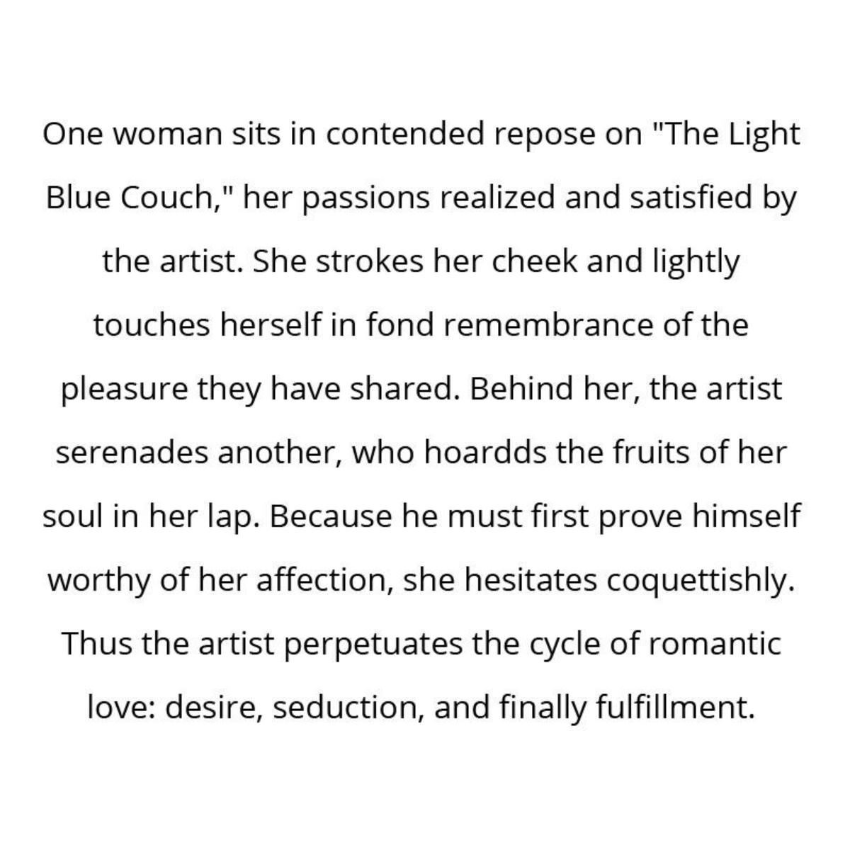"The Light Blue Couch" is a limited edition serigraph on canvas by Yruoz. The piece is hand signed by the artist, numbered, and accompanied by a certificate of authenticity. Measures approximately 36" x 36" (image). Reference #: 245285.