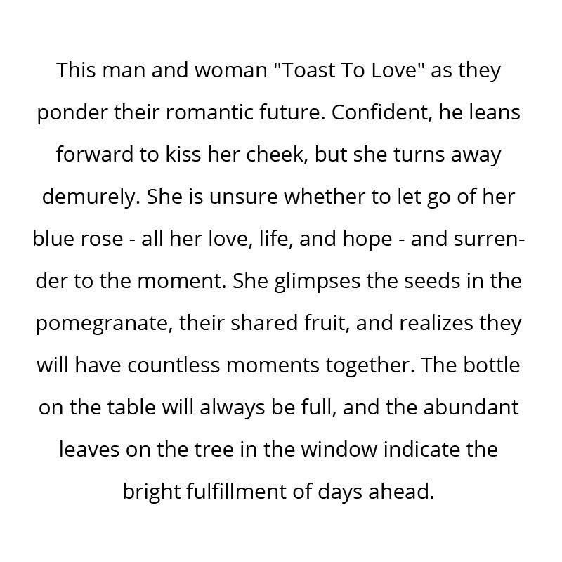 "Toast To Love" is a limited edition serigraph on canvas by Yruoz. The piece is hand signed by the artist, numbered, and accompanied by a certificate of authenticity. Measures approximately 40" x 30" (image).