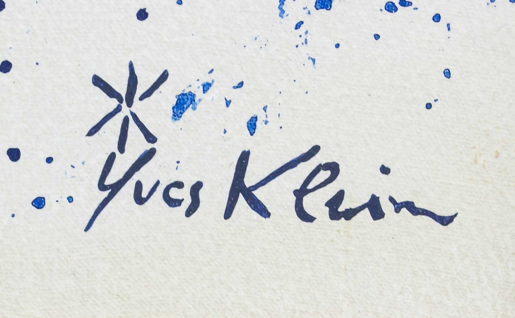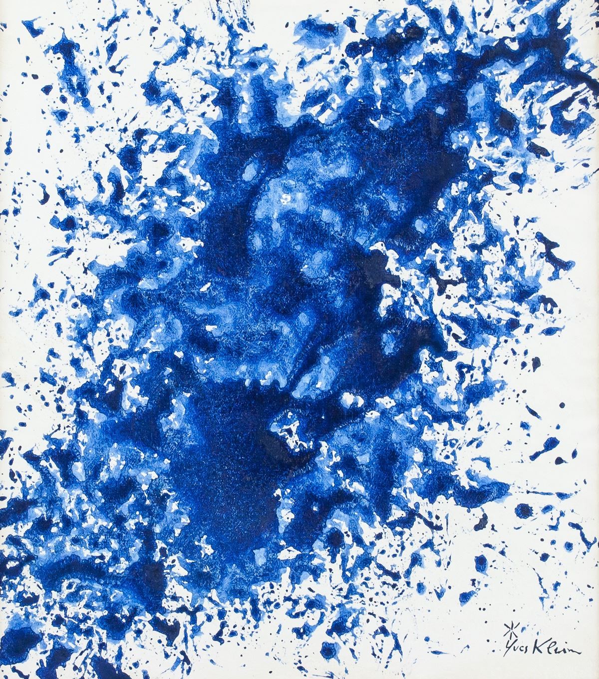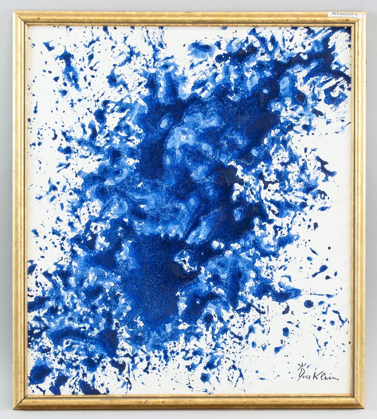 Oil on canvas, framed. Featuring an abstract expressionist composition in blue. Signed Yves Klein on the lower right corner. Attributed to Yves Klein (1928-1962, French). 47 x 41 cm (18.5 x 16 in). PROVENANCE: This lot carries limited provenance from a Southern Ontario estate
