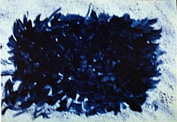 Oil on paper in the manner of Yves Klein "Untitled", circa 1940, private collection, unframed dimensions approximately 17x12. in the manner of Yves Klein, (born April 28, 1928, Nice, France—died June 6, 1962, Paris) French artist associated with the Parisian Nouveau Réalisme movement championed by the French critic Pierre Restany. The only painter in the founding group, Klein was a highly influential artist whose radical techniques and conceptual gestures laid the groundwork for much of the art of the 1960s and ’70s. His media were pure pigments, gold leaf, fire, water, live nude models (his “living brushes”), actions, and events.