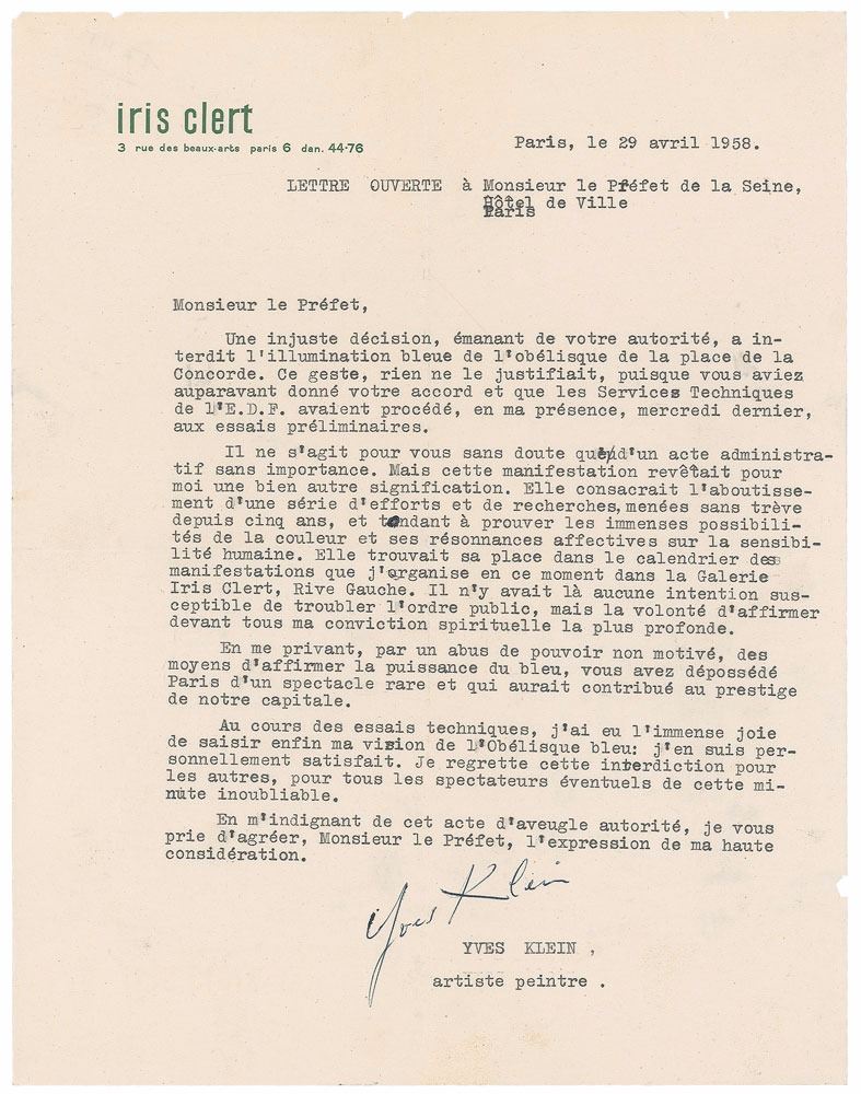 French artist (1928–1962) who was a leading member of the French artistic movement of Nouveau réalisme and a pioneer in the development of performance art; he died at the age of 34 after a series of heart attacks. TLS in French, one page, 8.25 x 10.5, Iris Clert letterhead, April 29, 1958. An open letter to the Prefect of the Seine, in full (translated): “An unjust decision, from your authority, banned the blue illumination of the obelisk in the Place de la Concorde. This gesture is not justified since you have previously given your consent and Technical Services of the EDF had carried out the preliminary tests in my presence last Wednesday. This is for you without doubt an unimportant administrative act. But for me this event was of a very different meaning. The culmination of a series of efforts and research without rest for five years, seeking to prove the immense possibilities of color and its emotional resonance on human sensitivity. It has a place in the event calendar I am now organizing in the Galerie Iris Clert, Rive Gauche. There was no intention to disturb the public order, but the willingness to affirm before all my deepest spiritual conviction. By depriving me, through an abuse of power without cause, means to assert the power of the blue, you have dispossessed Paris a rare sight that would have contributed to the prestige of our capital. During technical tests, I had the great joy of finally capturing my vision of Blue Obelisk: I am personally satisfied. I regret this prohibition for others, all potential viewers of this unforgettable moment.” In fine condition, with central vertical and horizontal folds, light creases, and trivial chipping to edges.