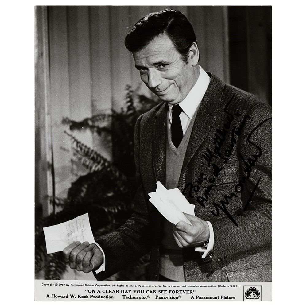 Glossy 7.75 x 9.75 Paramount promo photo for On a Clear Day You Can See Forever, signed and inscribed in black felt tip, "Pour Matthew, Amical souvenir, Y. Montand.” In fine condition, with trimmed edges.