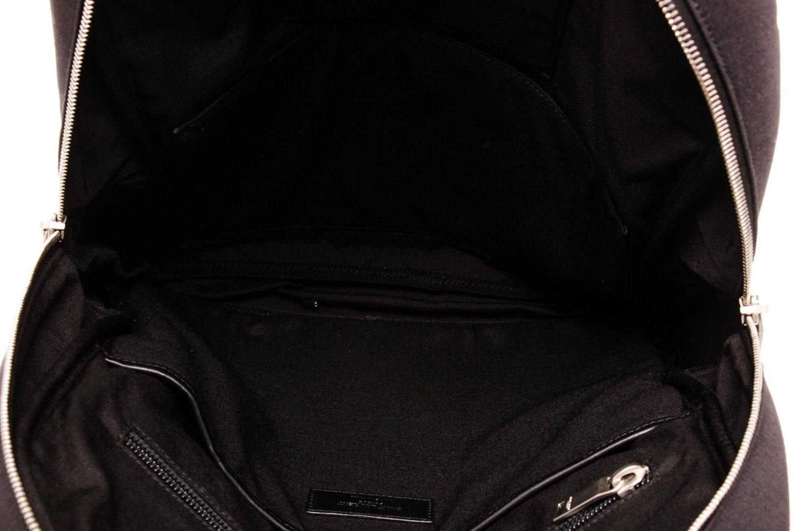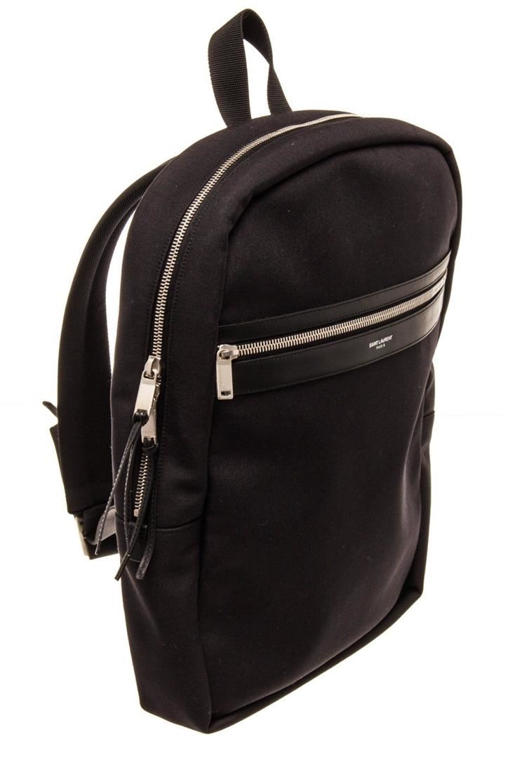 Yves Saint Laurent Black Canvas Backpack with black lining, interior zip pocket along back wall, front zip pocket, adjustable shoulder straps, two way zip closure.