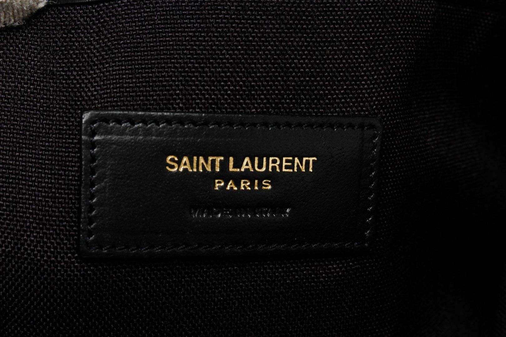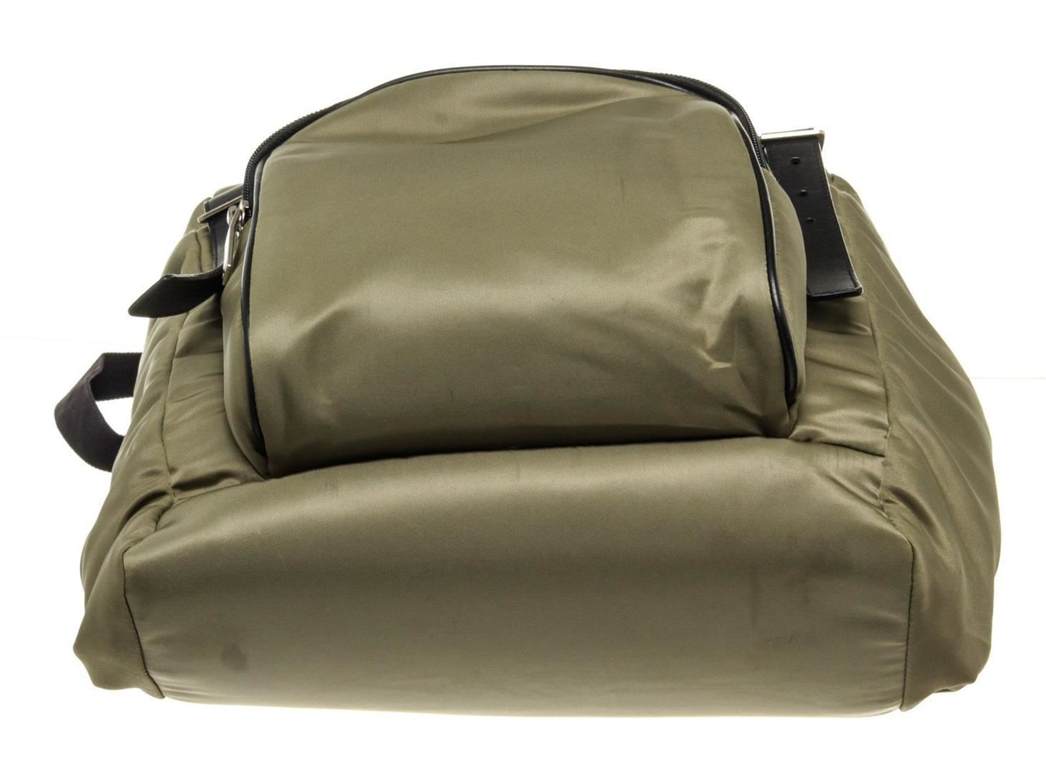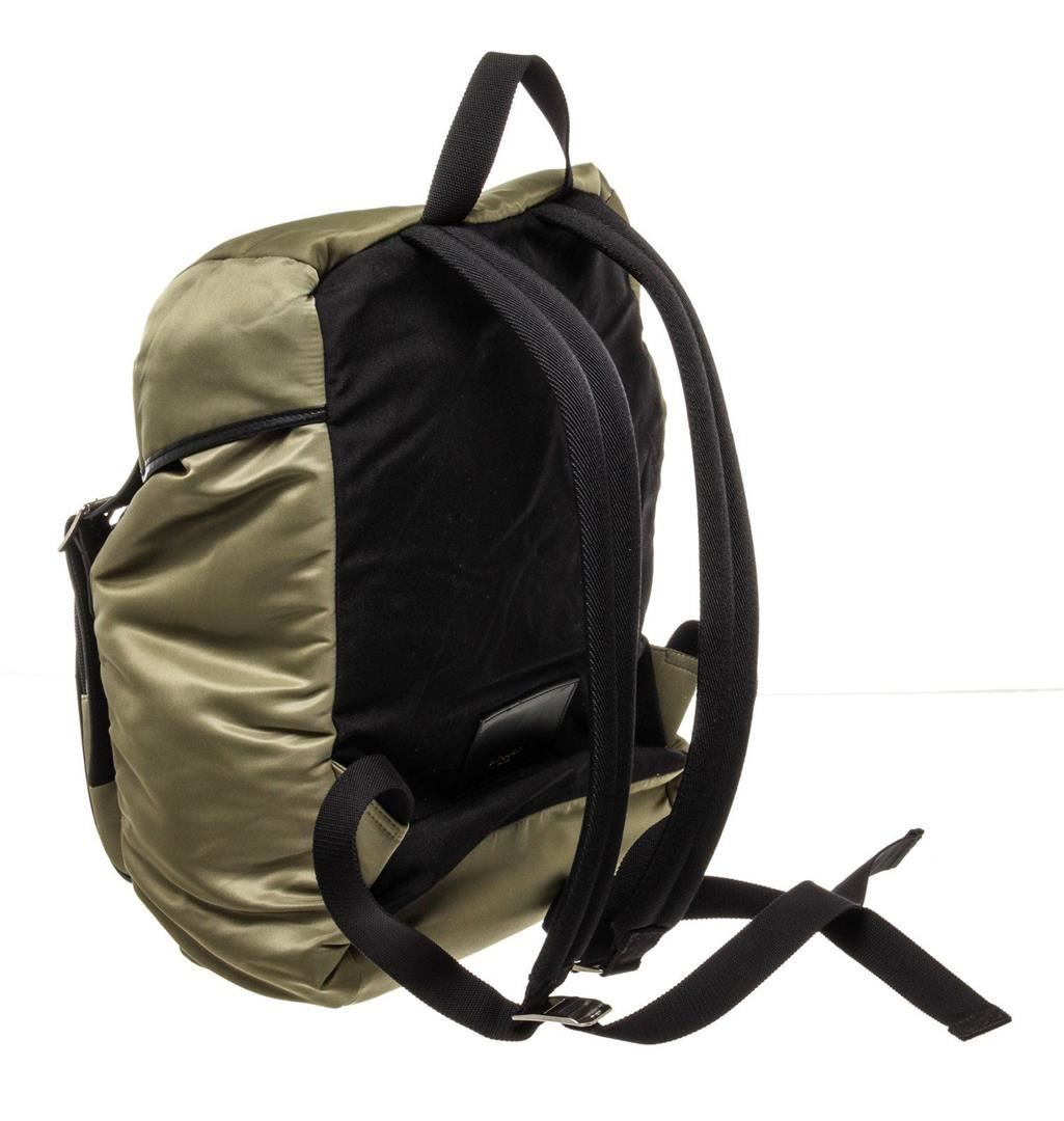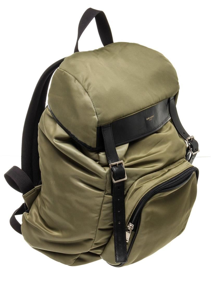 Yves Saint Laurent Green Leather Hunting Backpack Bag with leather, gold-tone hardware, trim leather, exterior zip pocket, interior slip pocket, shoulder strap and snap closure.
