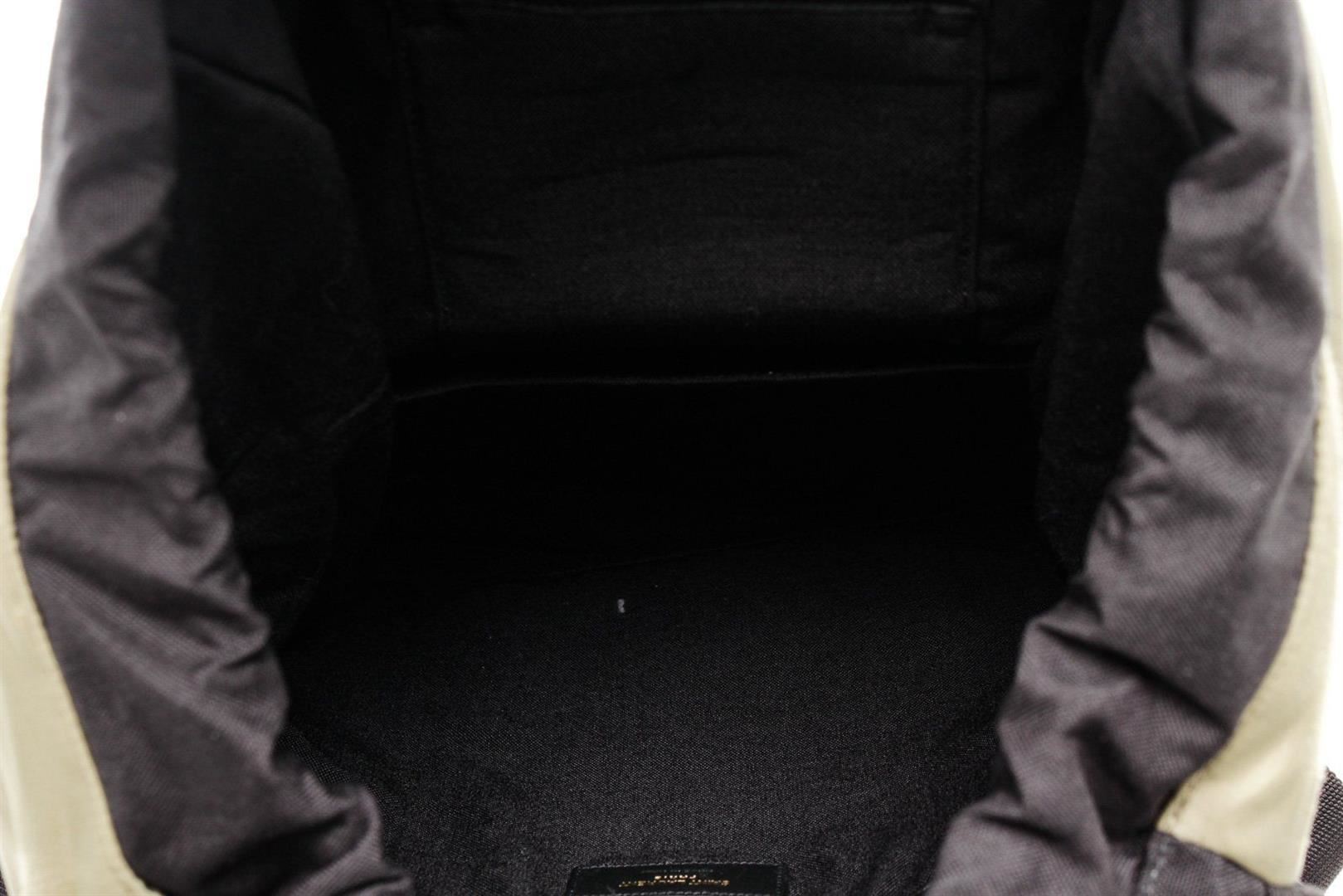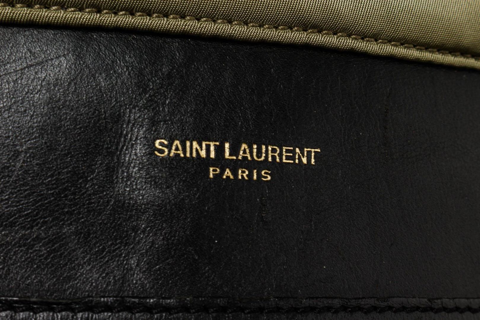 Yves Saint Laurent Green Leather Hunting Backpack Bag with leather, gold-tone hardware, trim leather, exterior zip pocket, interior slip pocket, shoulder strap and snap closure.