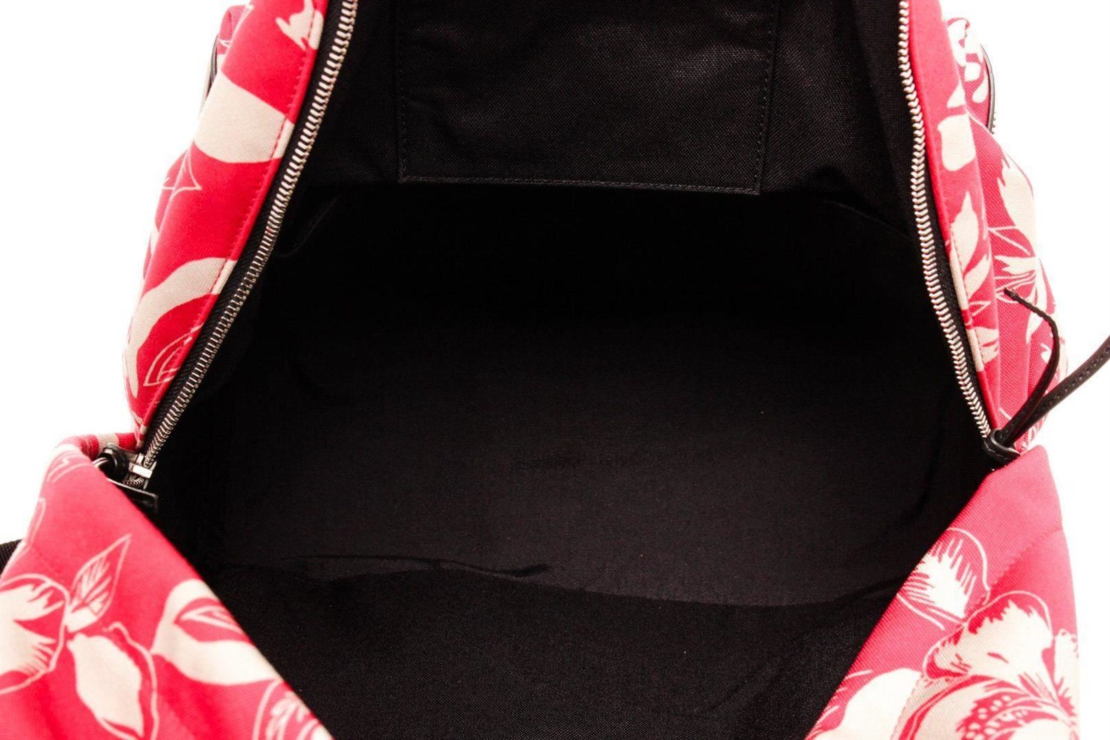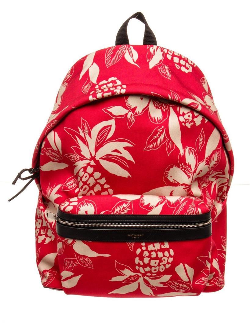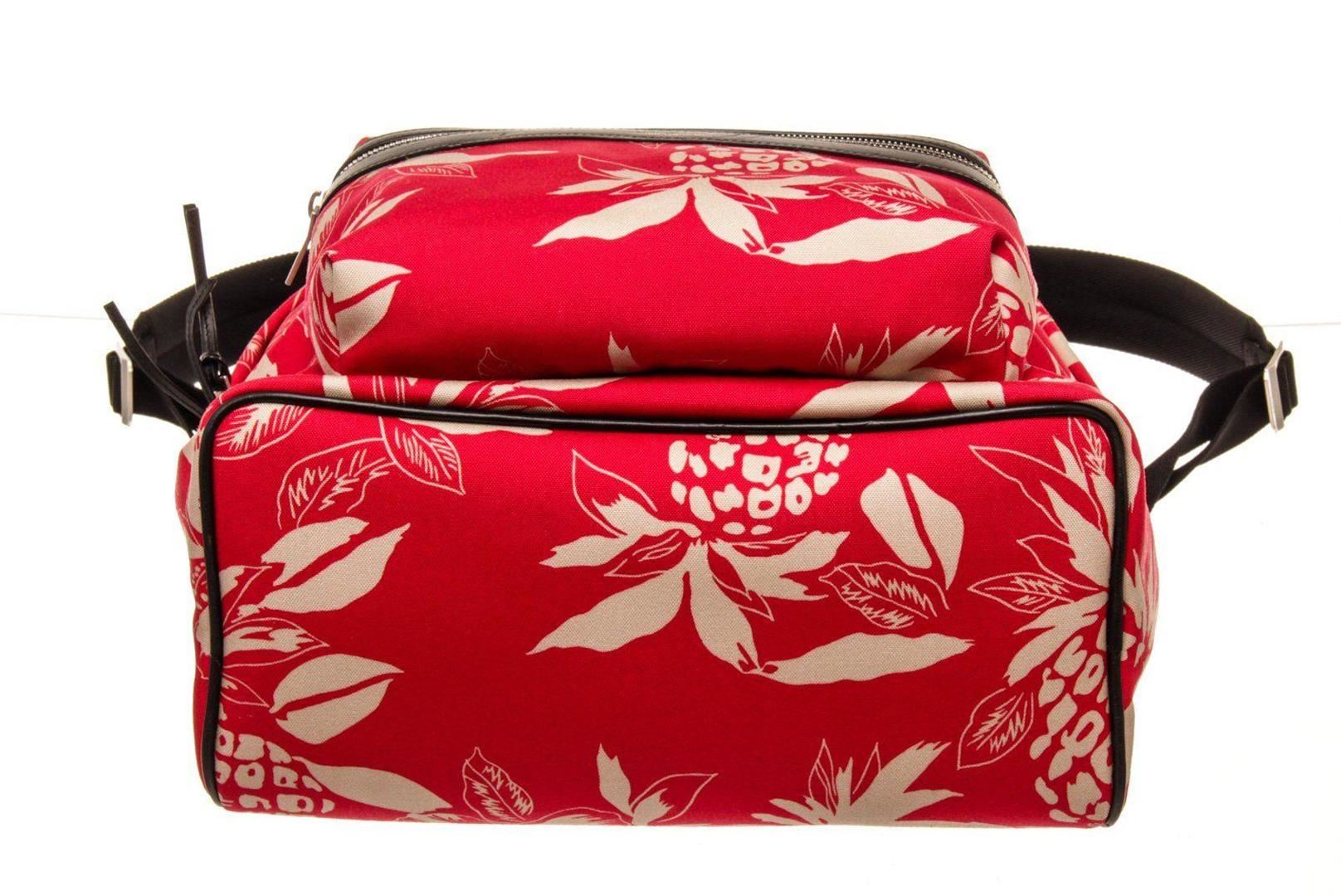 Yves Saint Laurent Red Canvas City Backpack with canvas lining, interior zip pocket along back wall, front zip pocket, adjustable shoulder straps, two way zip closure.