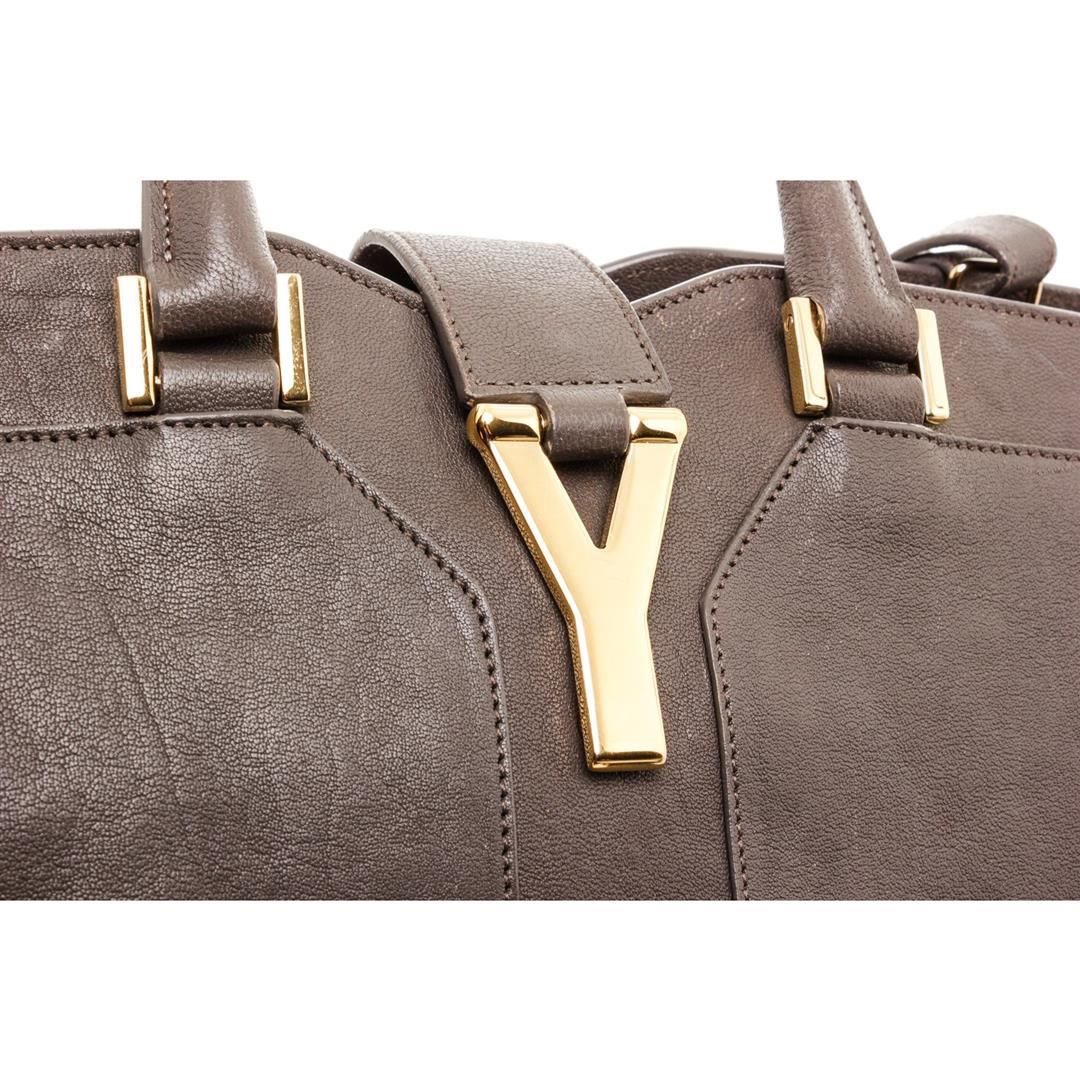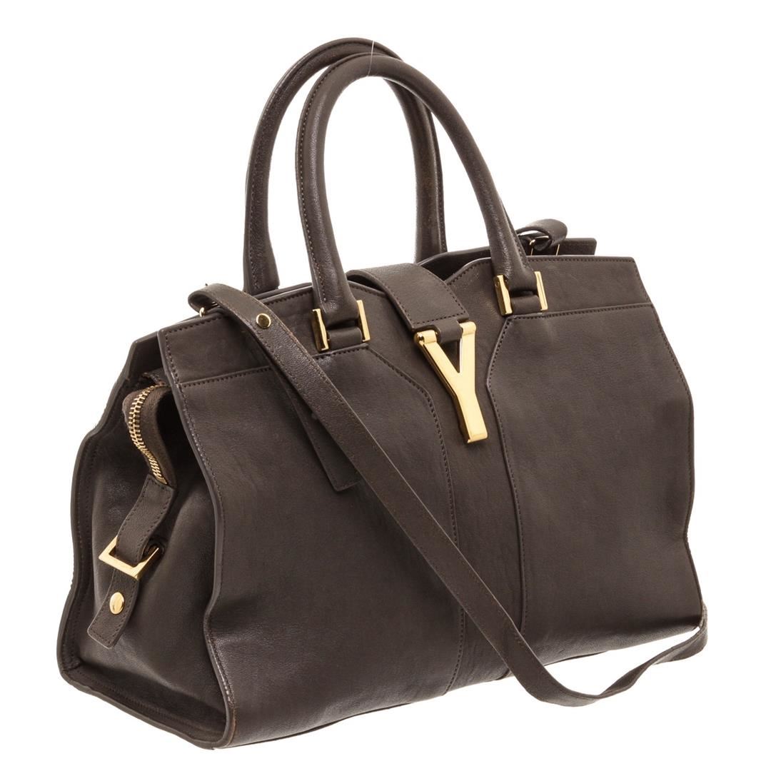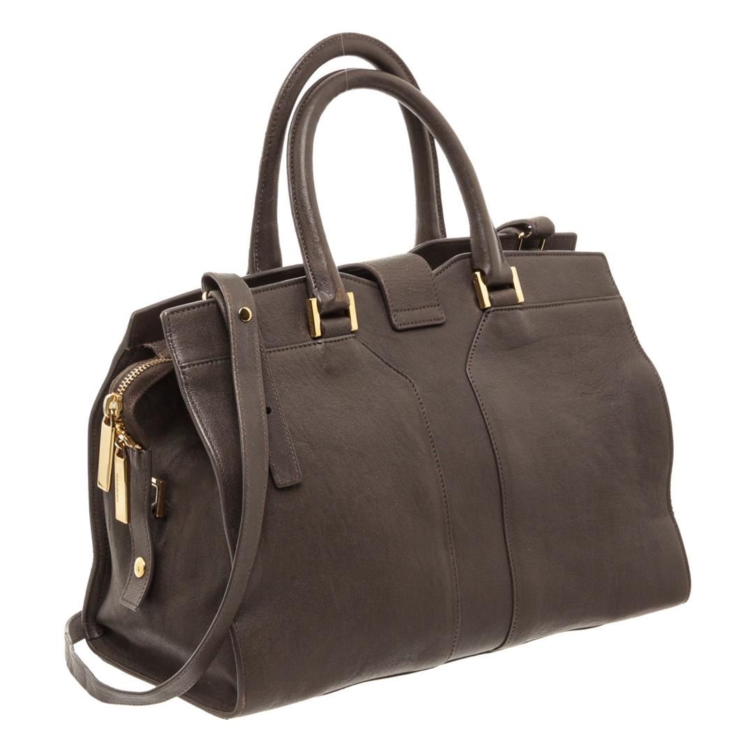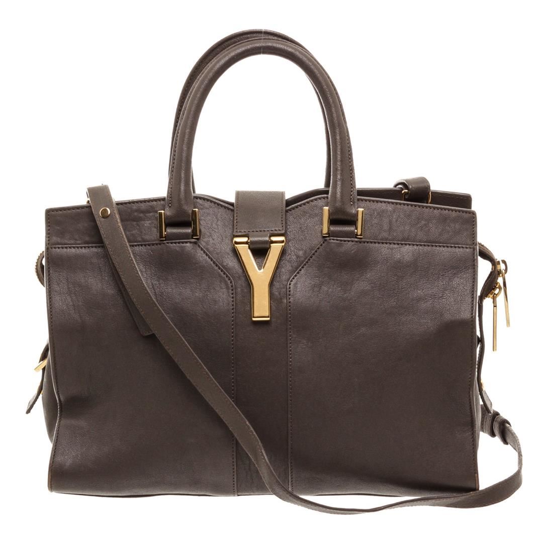 Yves Saint Laurent YSL dark gray structured sheepskin leather Mini Cabas ChYc Bag with gold-tone hardware, black canvas lining, interior zipper pocket, dual rolled top handles, optional adjustable crossbody strap, zip top closure with thin leather flap featuring Y magnetic snap.