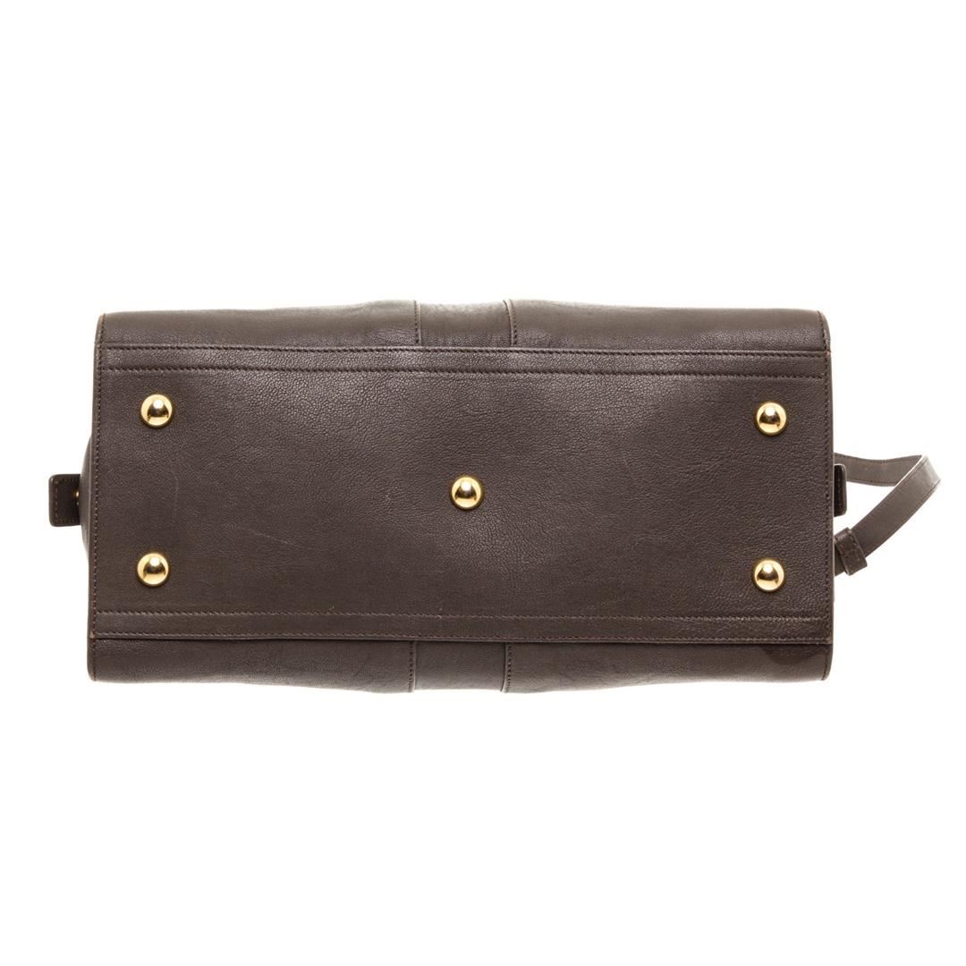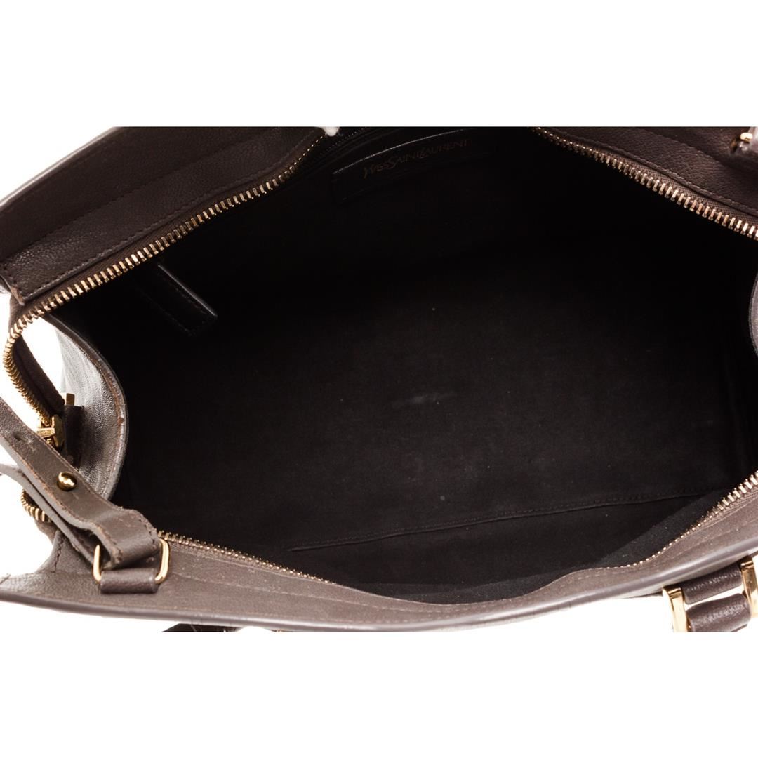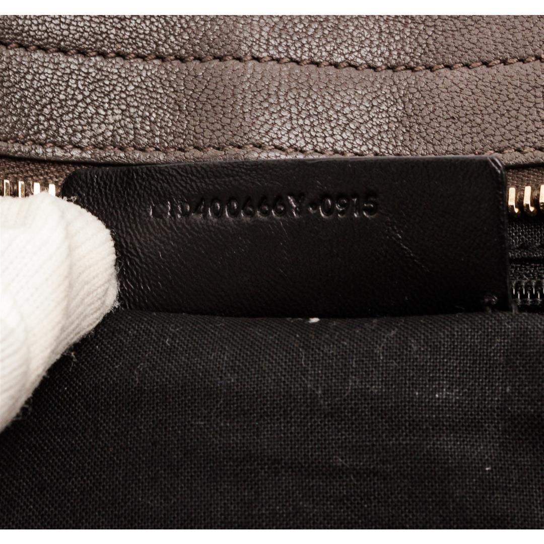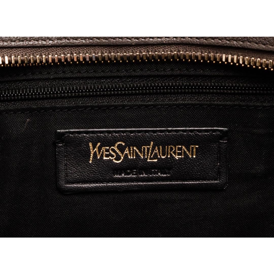 Yves Saint Laurent YSL dark gray structured sheepskin leather Mini Cabas ChYc Bag with gold-tone hardware, black canvas lining, interior zipper pocket, dual rolled top handles, optional adjustable crossbody strap, zip top closure with thin leather flap featuring Y magnetic snap.