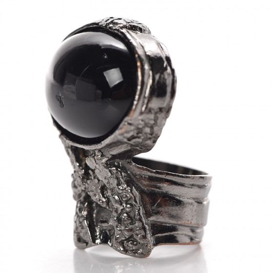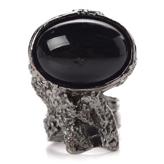 This ring features a smooth black cabochon glass oval, set in a rough, twisted gunmetal silver frame that extends into a smooth gunmetal ring.