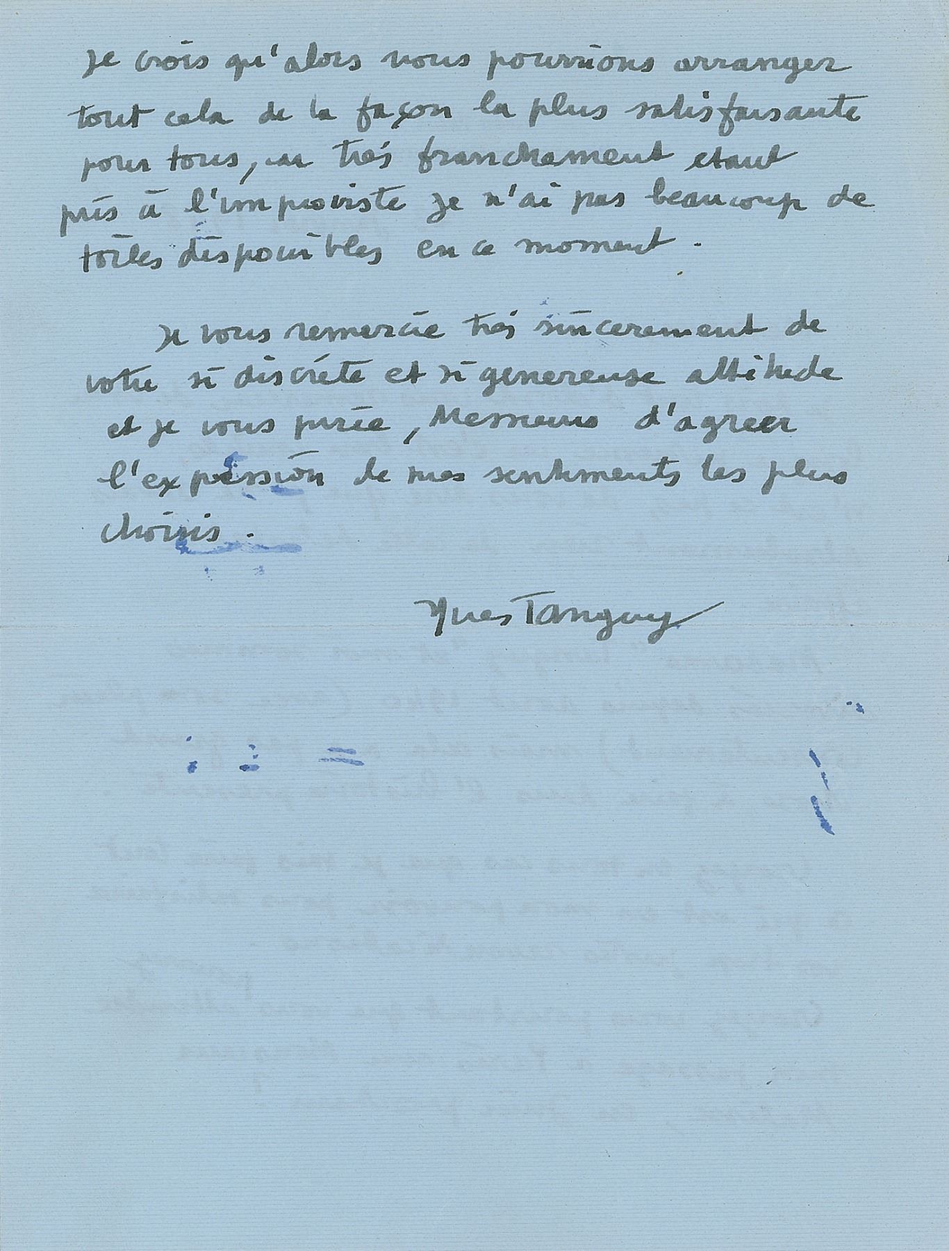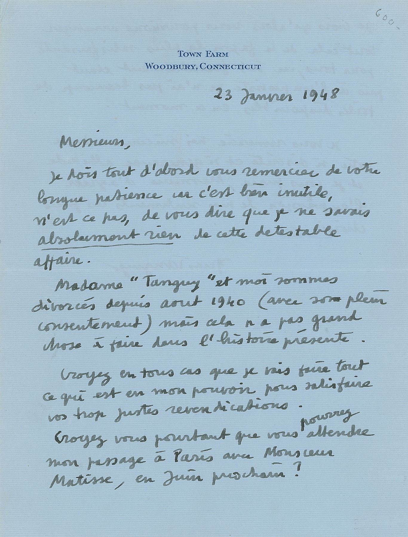 ALS in French, one page both sides, 6.5 x 8.5, personal letterhead, January 23, 1948. In part (translated): "First I have to thank you for your long patience, as it is quite useless to tell you that I did not know anything about this detestable affair. Mrs. 'Tanguy' and I are divorced since August 1940 (with her consent), but that hasn't much to do with the story at hand. In any case, believe me, that I shall do anything in my power to satisfy your claims. Would it be possible, however, to wait until I come to Paris with Mr. Matisse, next June? I believe we can settle this in a way satisfactory to everybody, but to be honest, as I was caught by surprise, there are at this moment not many paintings that I can dispose of." In fine condition. Art dealer Pierre Matisse, the son Henri, was Tanguy's close friend and patron. He had married Jeannette Ducrocq in 1927, divorcing her in favor of the artist and poet Kay Sage in August 1940.