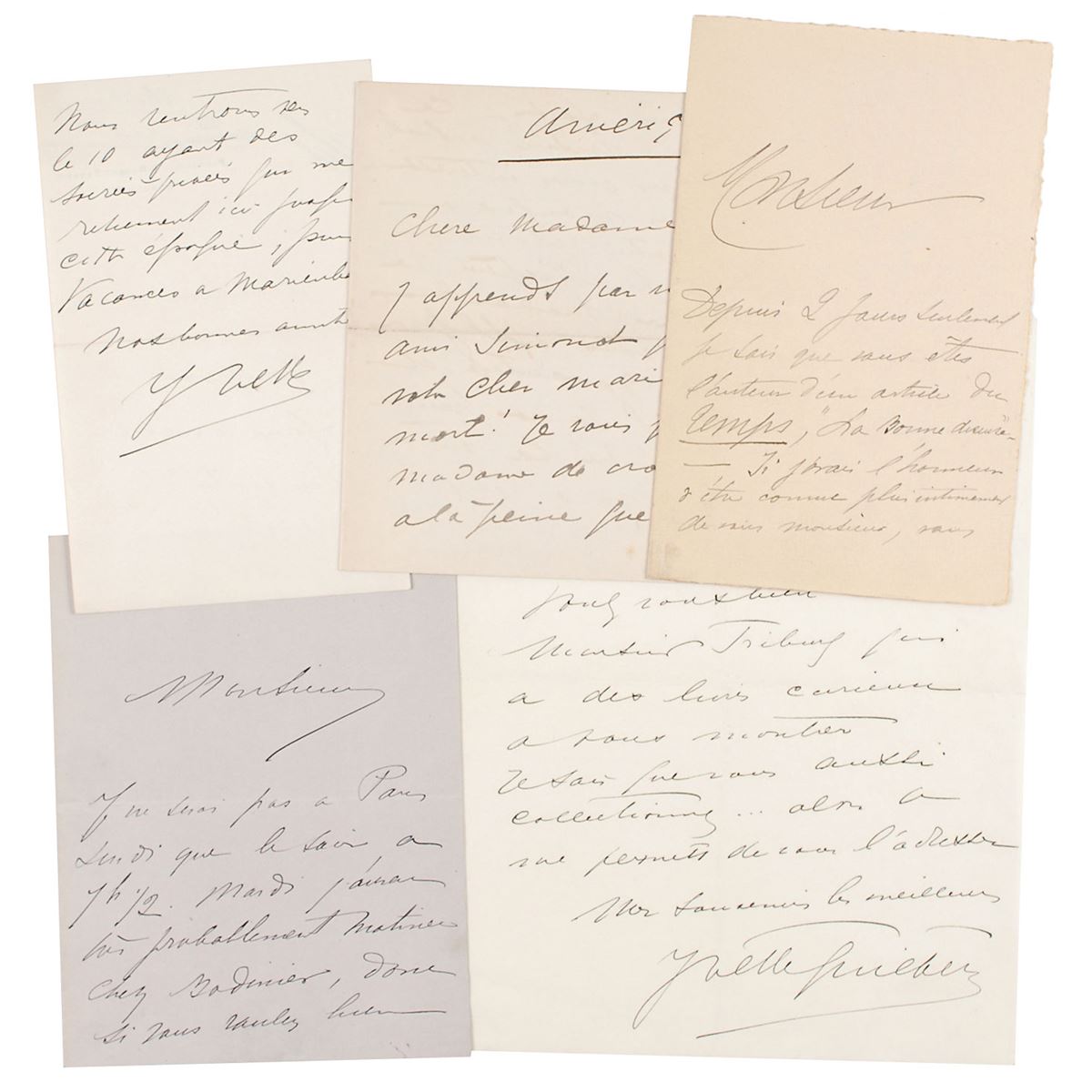 Renowned French actress and cabaret singer (1865–1944) who was immortalized in a number of works by prominent Belle Epoche poster artists Henri Toulouse-Lautrec and Jules Cheret. Five ALSs in French, totaling twelve pages, all undated. Untranslated letters to various recipients, including a music critic she would like to get to know. In overall fine condition.