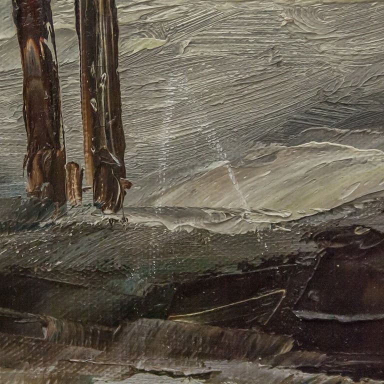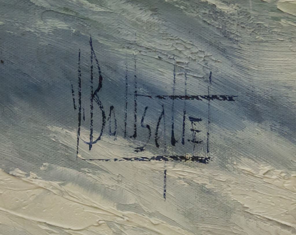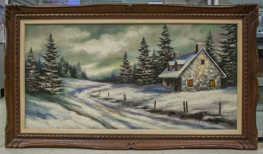 Oil on canvas, framed. Featuring winter landscape. Signed "Y Bousquet" to the bottom left corner. "LA VIEILLE MAISON" stamped on verso. Attributed to Yvon Bousquiet (Canadian, 1923-1997). Canvas size: 60 x 121 cm (23.5 x 47.5 inches). Frame size: 81 x 142 cm (32 x 56 inches).
